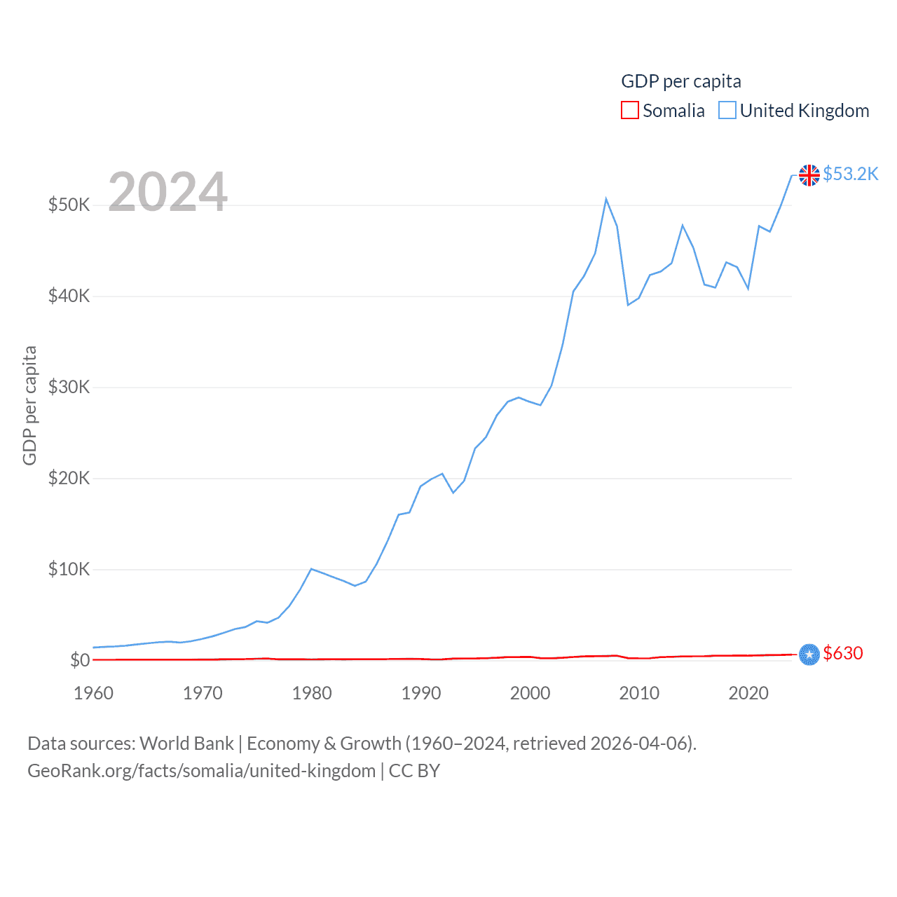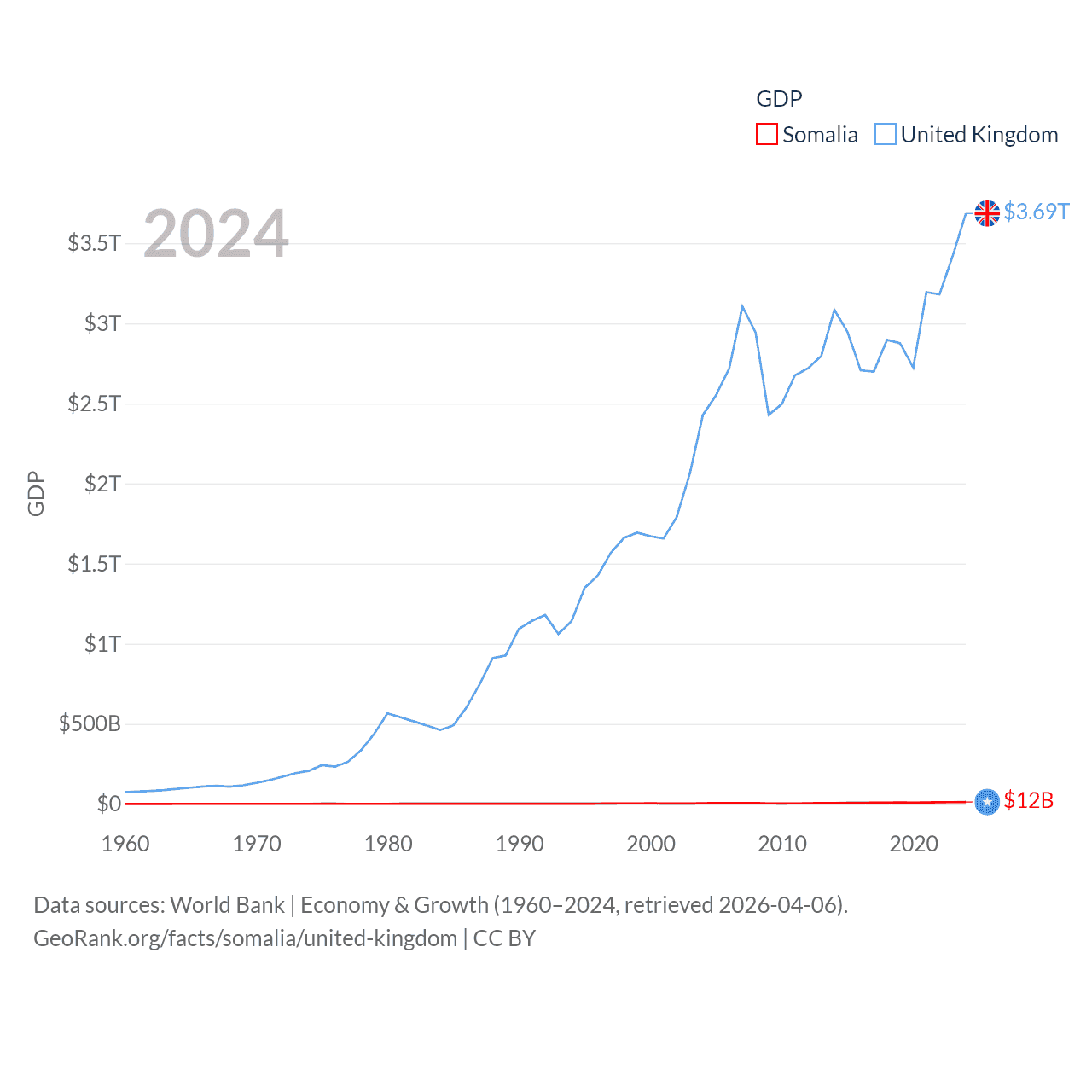 By GDP, Somalia ranks 150/197 ($12B) and The United Kingdom ranks 6/197 ($3.69T). By GDP per capita, Somalia ranks 192/197 ($630), while The United Kingdom ranks 22/197 ($53,246).
