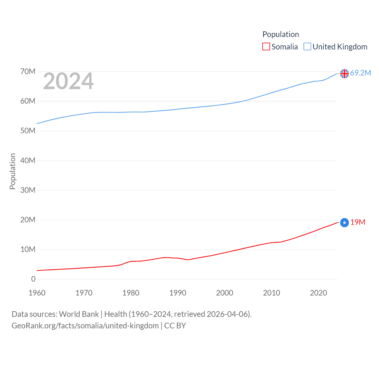 Somalia has a population of 19M (ranked 68/197), compared with 69.2M in The United Kingdom (ranked 21/197). Somalia's land area is 242,217 sq mi versus 93,410 sq mi for The United Kingdom (ranked 42nd vs. 78th).