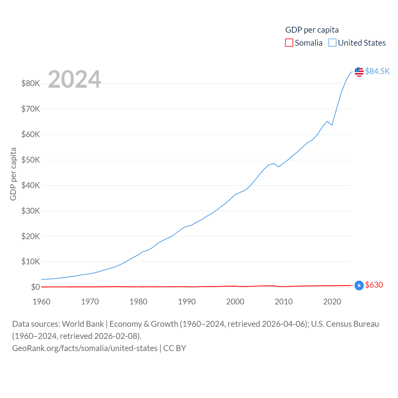 By GDP, Somalia ranks 150/197 ($12B) and The United States ranks 1/197 ($28.8T). By GDP per capita, Somalia ranks 192/197 ($630), while The United States ranks 10/197 ($84,534).