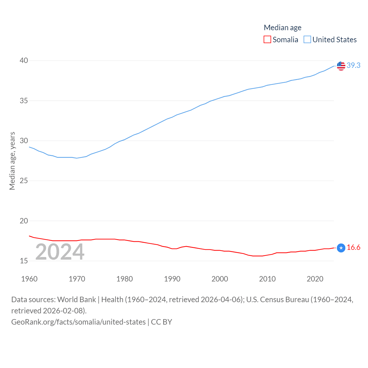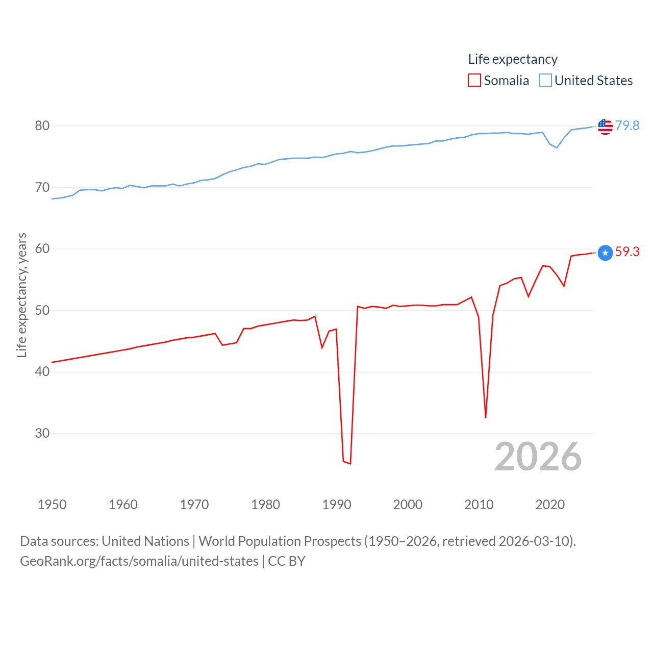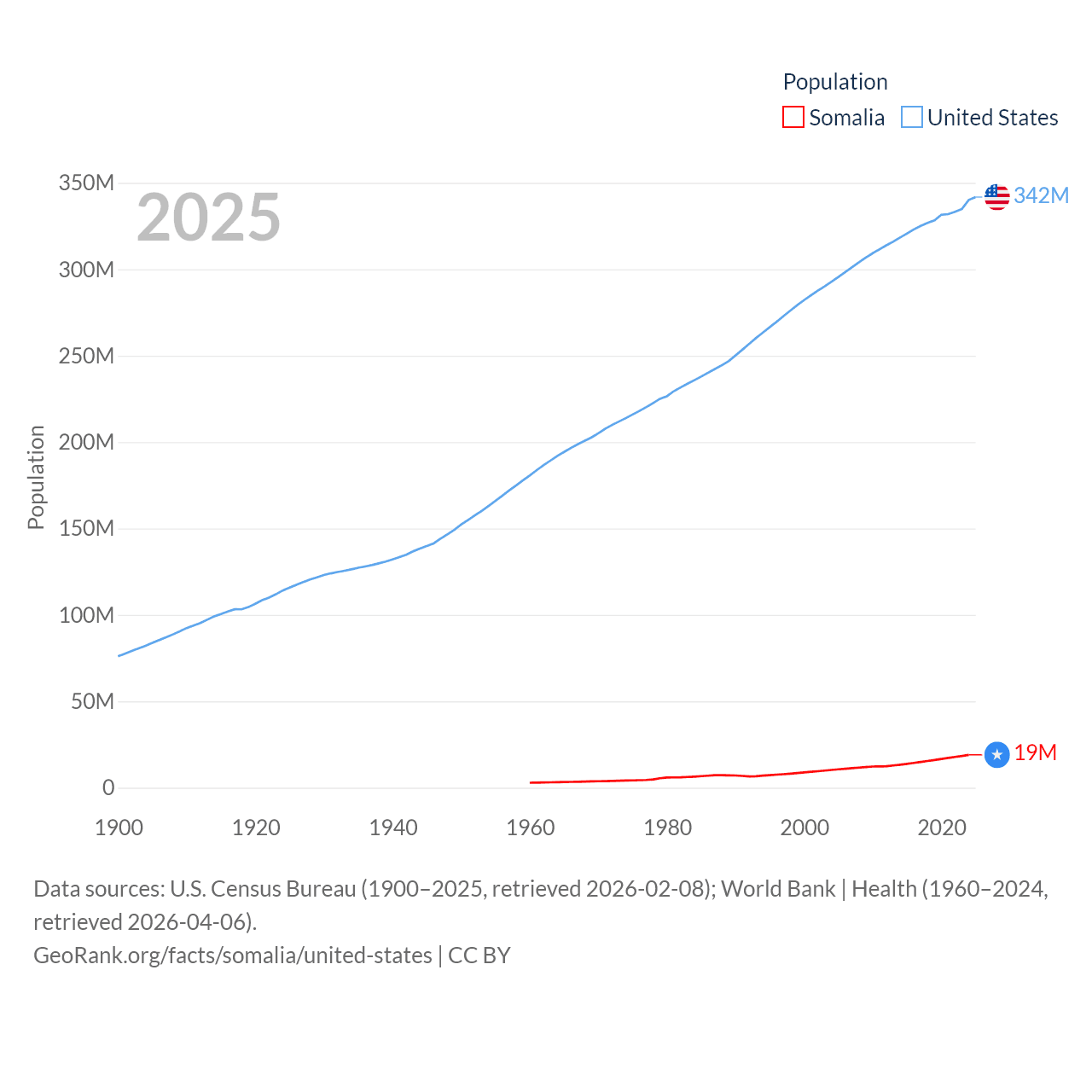 Somalia has a population of 19M (ranked 68/197), compared with 342M in The United States (ranked 3/197). Somalia's land area is 242,217 sq mi versus 3,531,839 sq mi for The United States (ranked 42nd vs. 3rd).