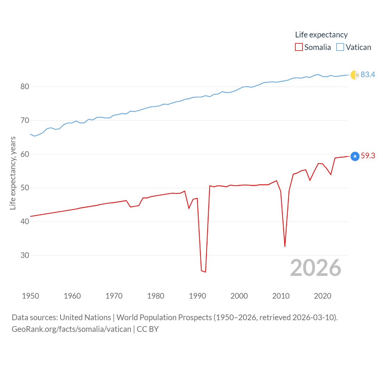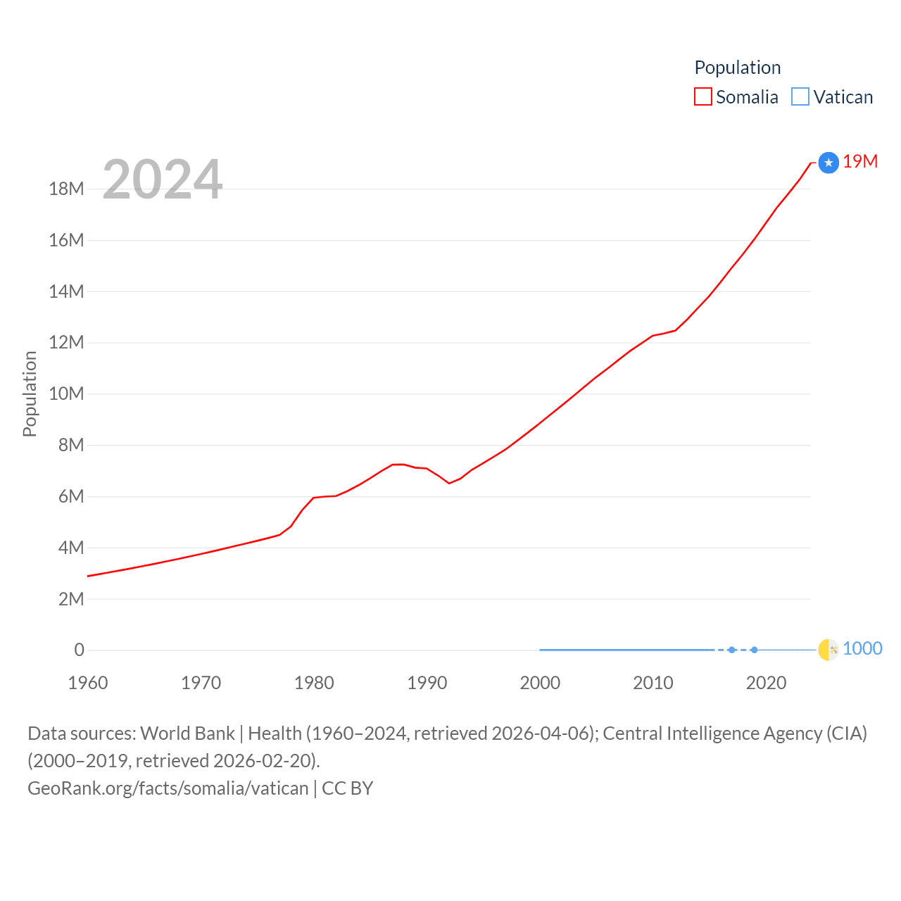 Somalia has a population of 19M (ranked 68/197), compared with 1K in The Vatican (ranked 197/197). Somalia's land area is 242,217 sq mi versus 0.17 sq mi for The Vatican (ranked 42nd vs. 197th).