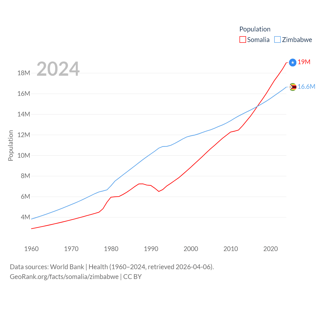 Somalia has a population of 19M (ranked 68/197), compared with 16.6M in Zimbabwe (ranked 74/197). Somalia's land area is 242,217 sq mi versus 149,364 sq mi for Zimbabwe (ranked 42nd vs. 60th).