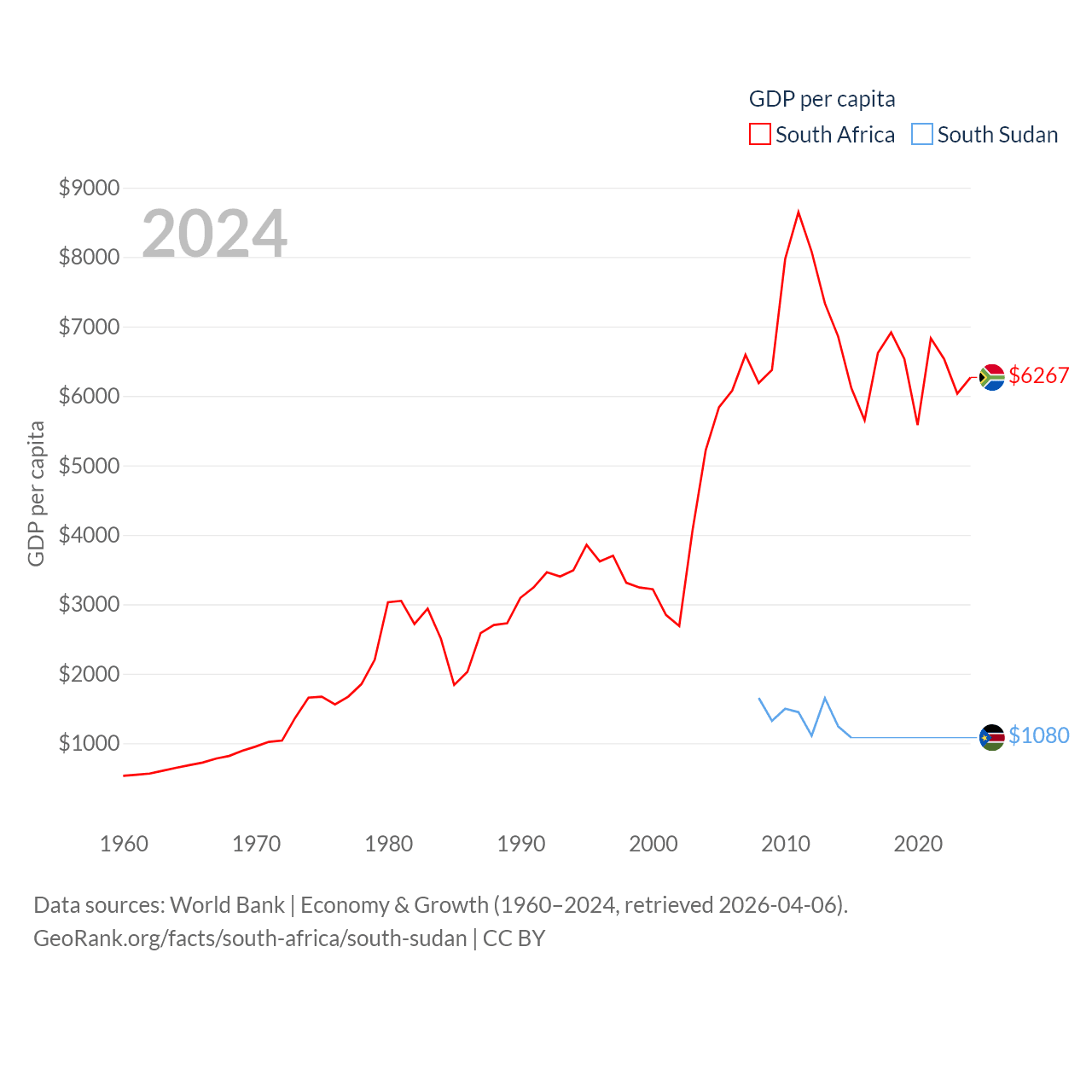 By GDP, South Africa ranks 40/197 ($401B) and South Sudan ranks 149/197 ($12B). By GDP per capita, South Africa ranks 111/197 ($6,267), while South Sudan ranks 175/197 ($1,080).