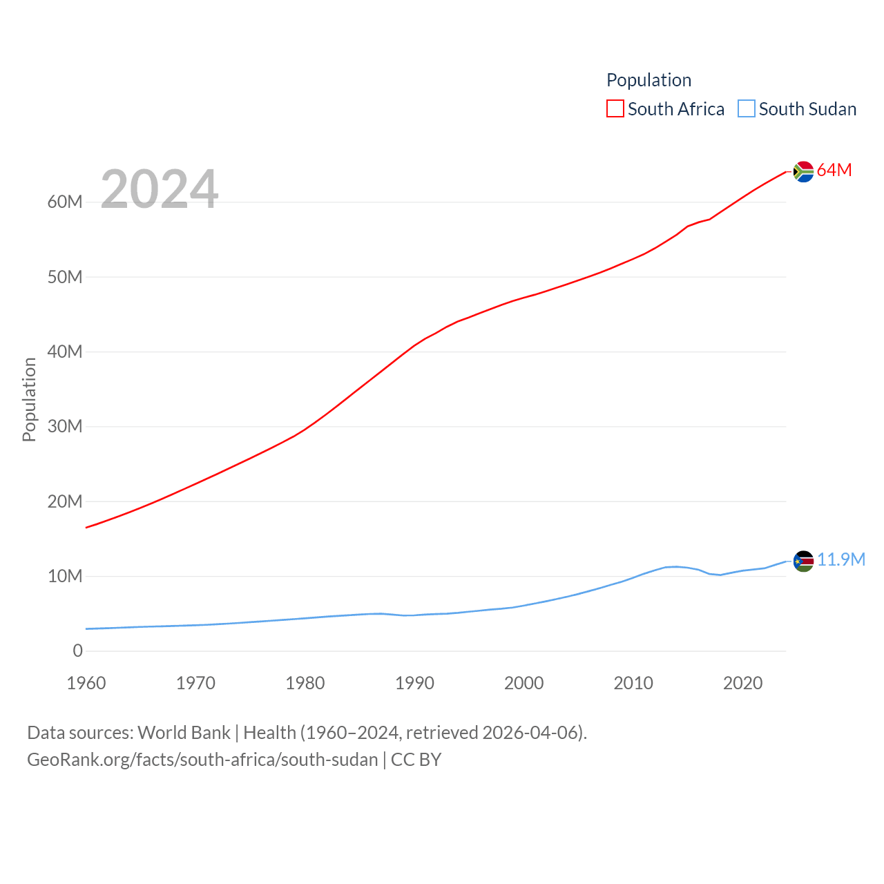 South Africa has a population of 64M (ranked 24/197), compared with 11.9M in South Sudan (ranked 81/197). South Africa's land area is 468,377 sq mi versus 243,990 sq mi for South Sudan (ranked 24th vs. 41st).