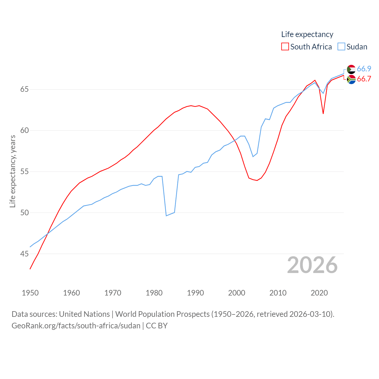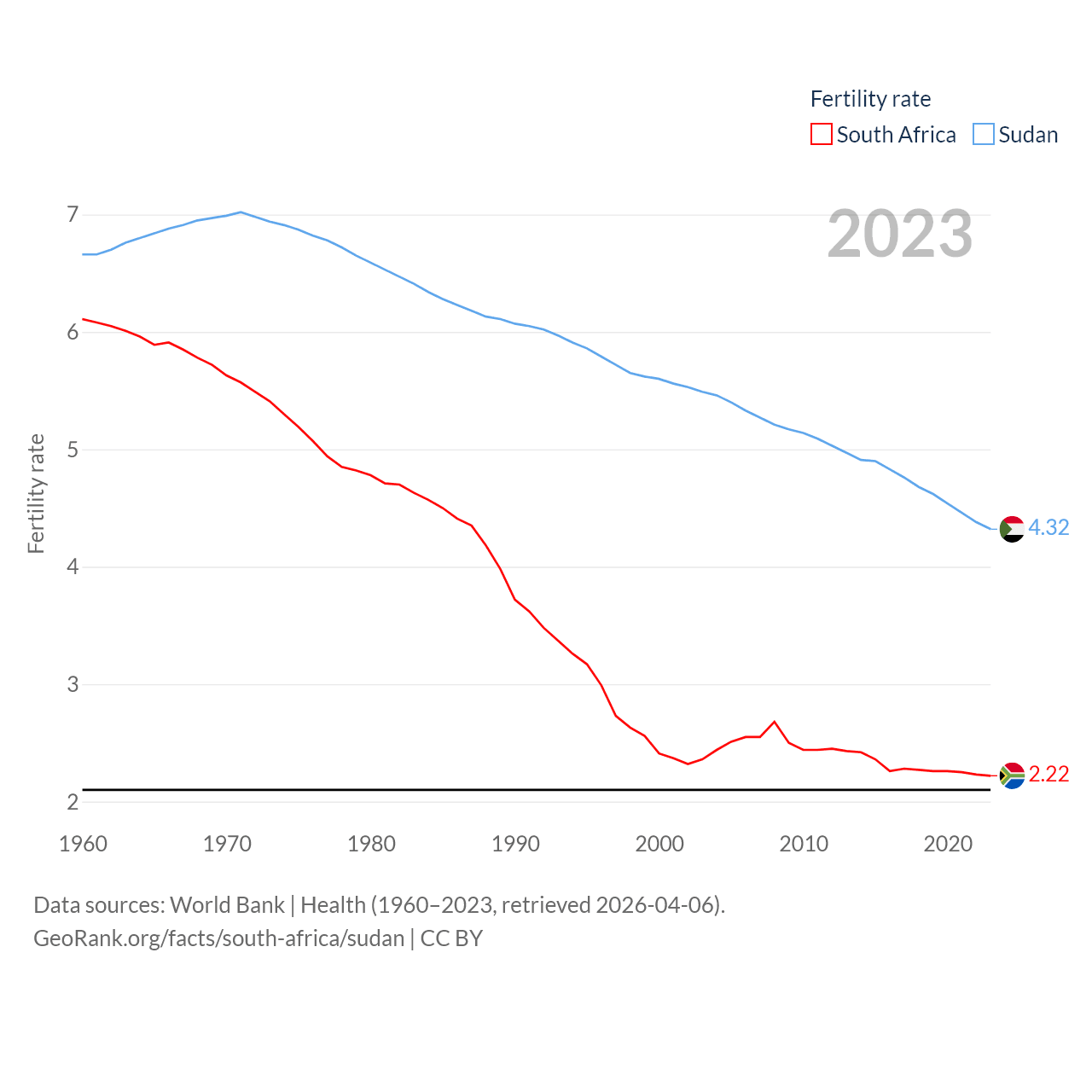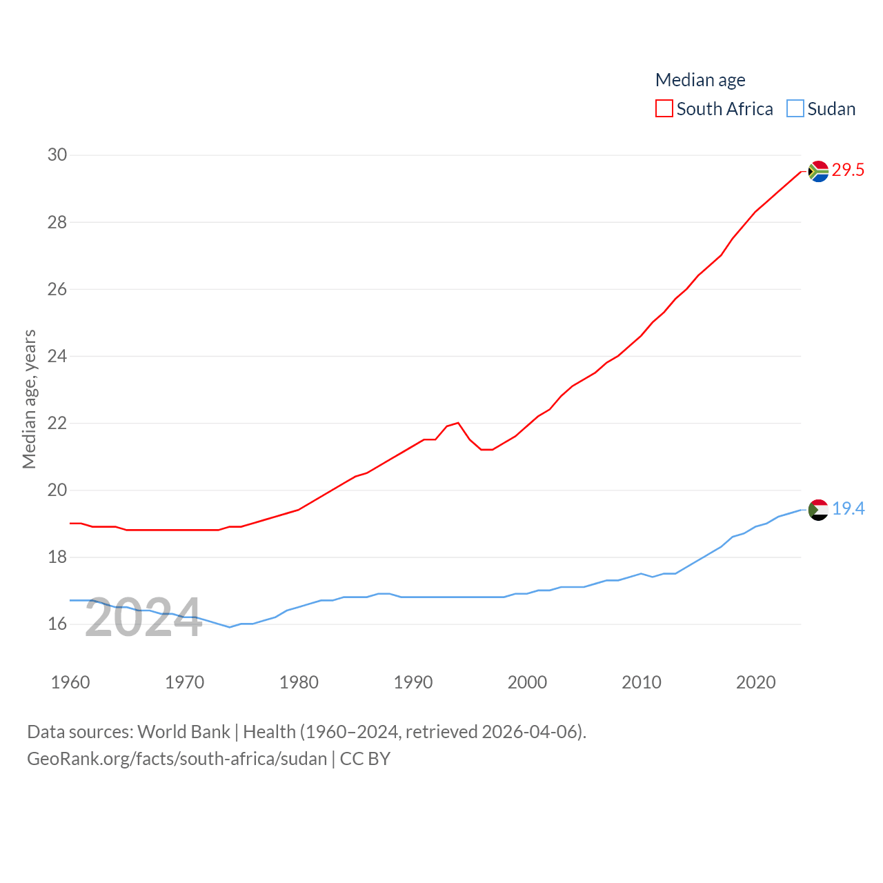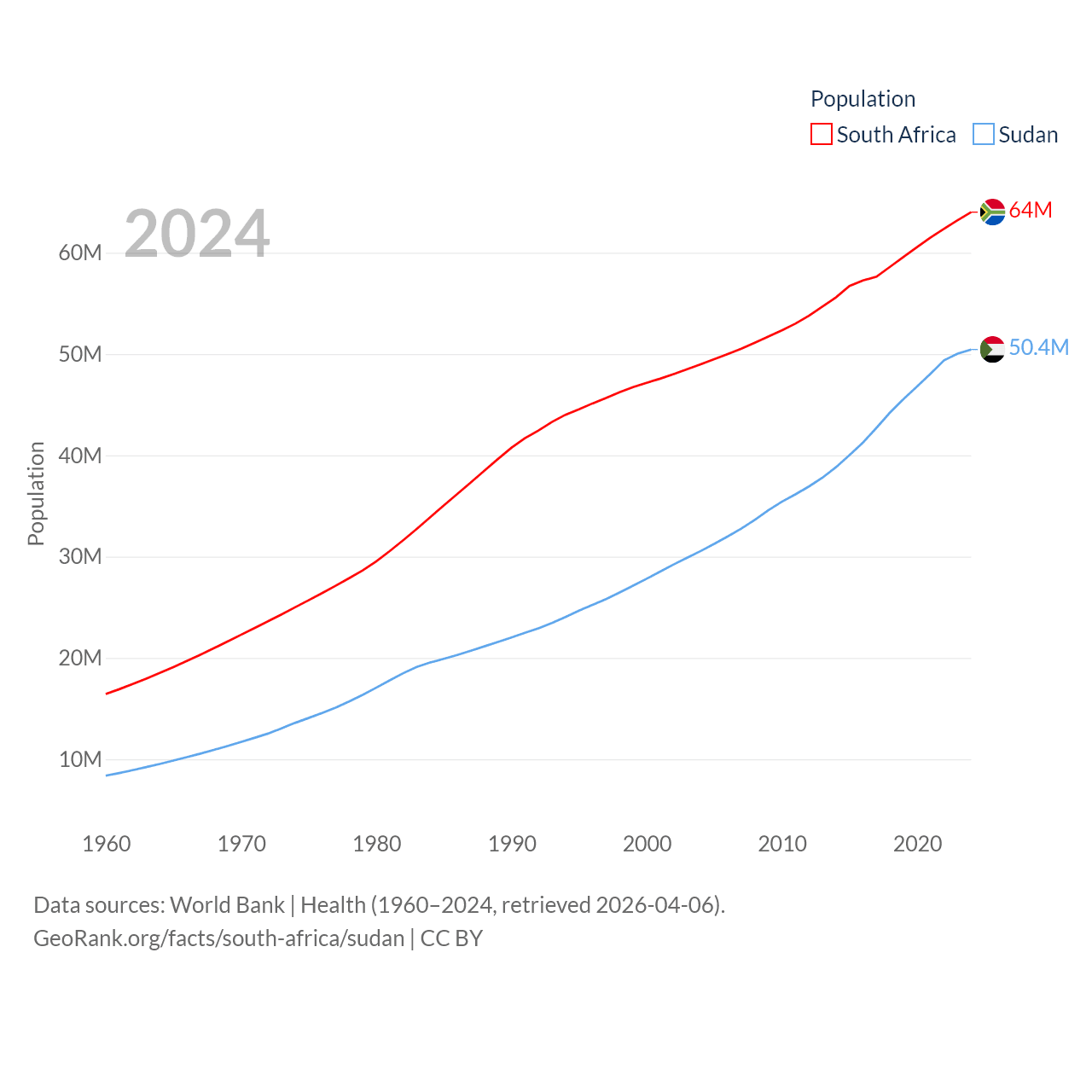 South Africa has a population of 64M (ranked 24/197), compared with 50.4M in Sudan (ranked 30/197). South Africa's land area is 468,377 sq mi versus 721,239 sq mi for Sudan (ranked 24th vs. 15th).