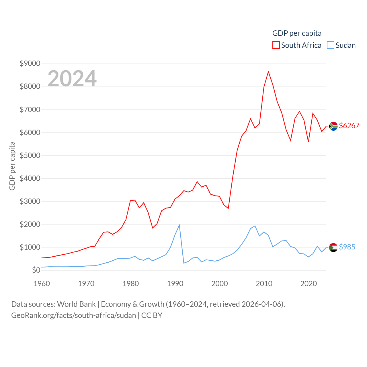 By GDP, South Africa ranks 40/197 ($401B) and Sudan ranks 94/197 ($49.7B). By GDP per capita, South Africa ranks 111/197 ($6,267), while Sudan ranks 179/197 ($985).