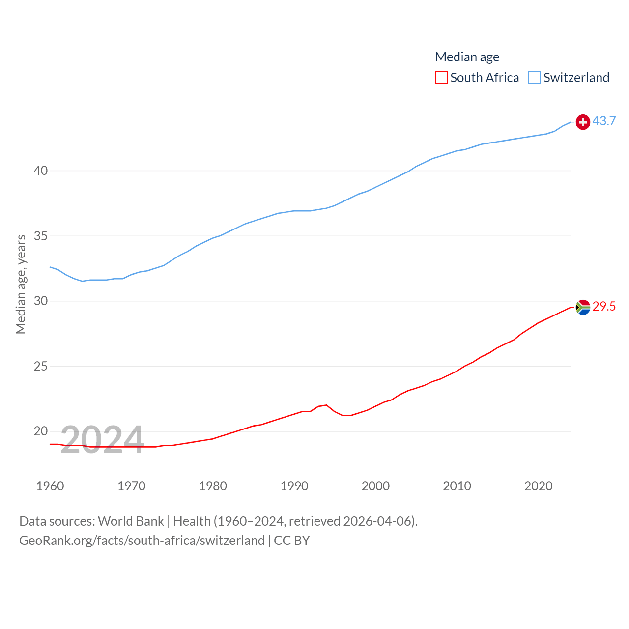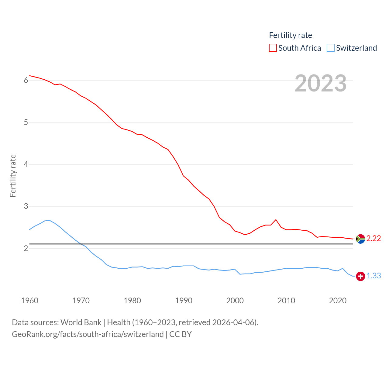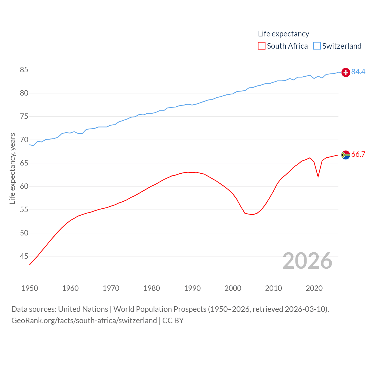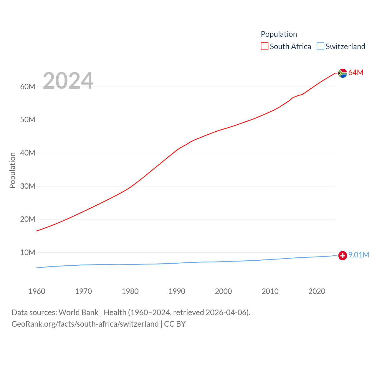 South Africa has a population of 64M (ranked 24/197), compared with 9.01M in Switzerland (ranked 101/197). South Africa's land area is 468,377 sq mi versus 15,255 sq mi for Switzerland (ranked 24th vs. 131st).