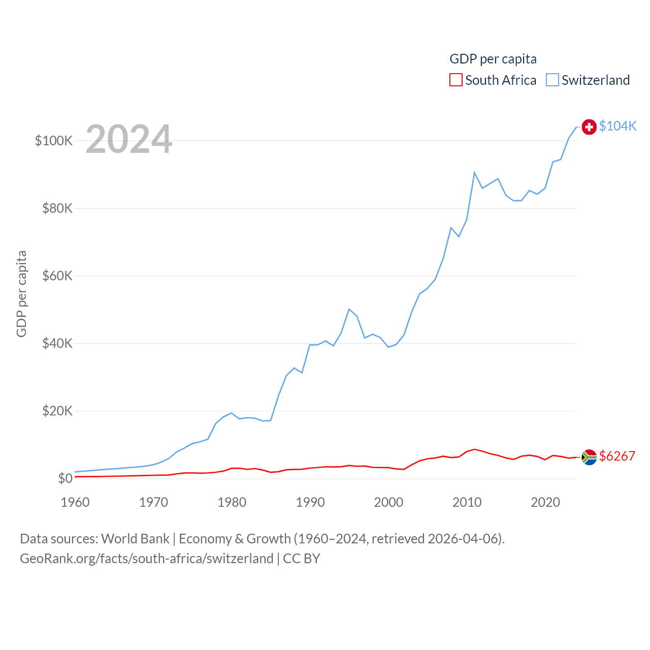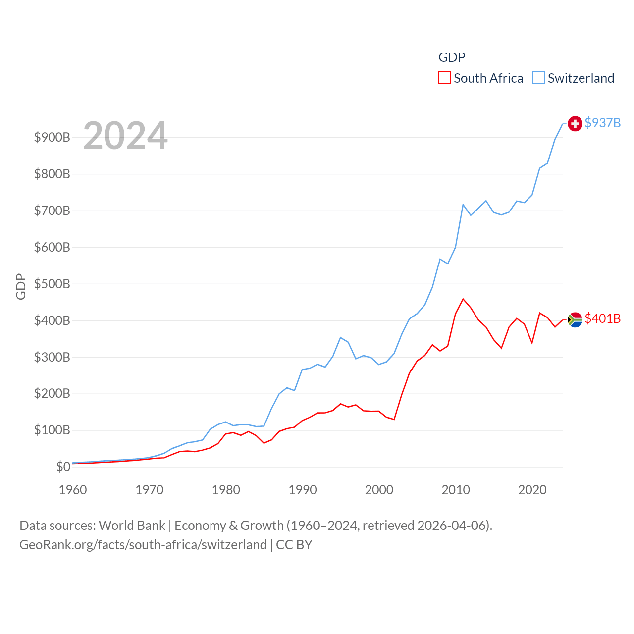 By GDP, South Africa ranks 40/197 ($401B) and Switzerland ranks 20/197 ($937B). By GDP per capita, South Africa ranks 111/197 ($6,267), while Switzerland ranks 5/197 ($103,998).