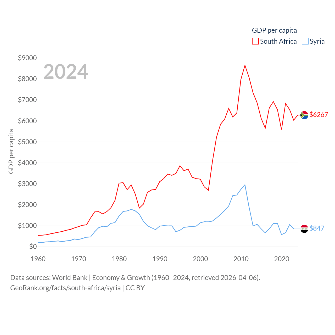 By GDP, South Africa ranks 40/197 ($401B) and Syria ranks 129/197 ($20B). By GDP per capita, South Africa ranks 111/197 ($6,267), while Syria ranks 185/197 ($847).
