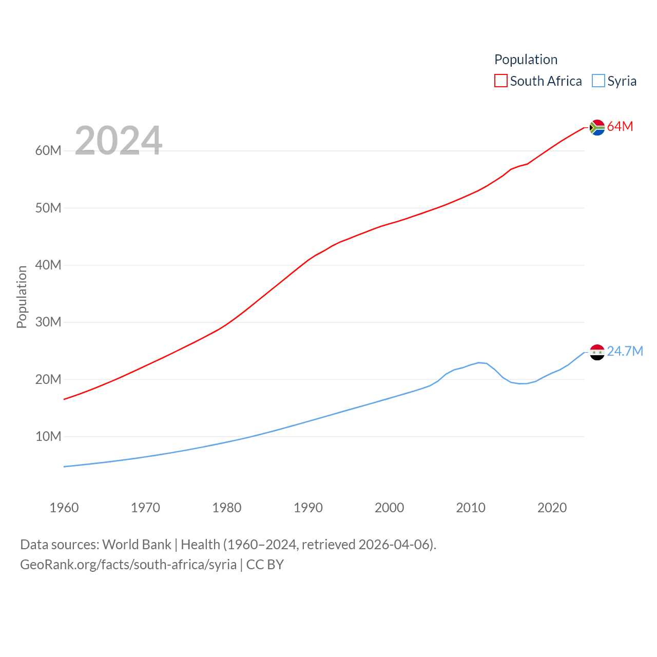 South Africa has a population of 64M (ranked 24/197), compared with 24.7M in Syria (ranked 57/197). South Africa's land area is 468,377 sq mi versus 70,900 sq mi for Syria (ranked 24th vs. 87th).