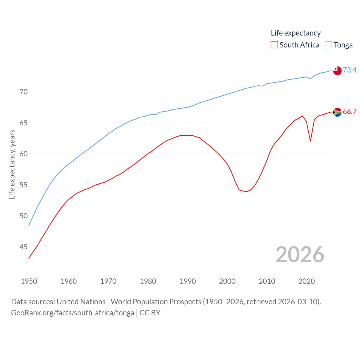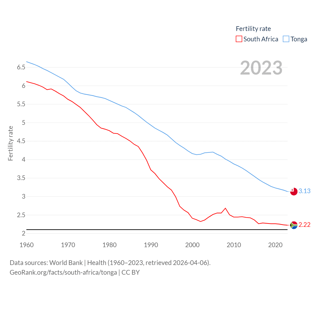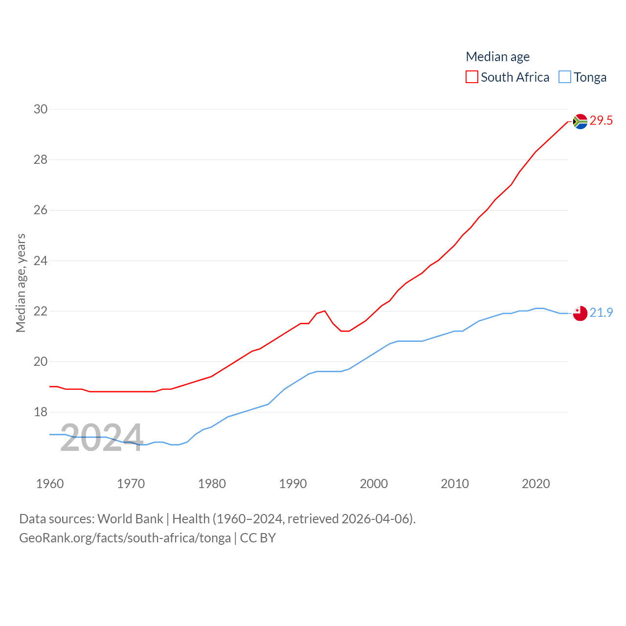 South Africa has a population of 64M (ranked 24/197), compared with 104K in Tonga (ranked 183/197). South Africa's land area is 468,377 sq mi versus 278 sq mi for Tonga (ranked 24th vs. 176th).