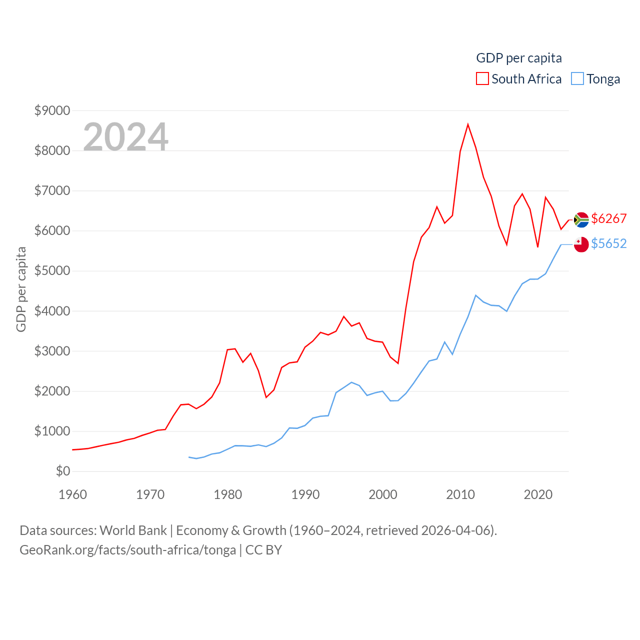 By GDP, South Africa ranks 40/197 ($401B) and Tonga ranks 191/197 ($591M). By GDP per capita, South Africa ranks 111/197 ($6,267), while Tonga ranks 115/197 ($5,652).
