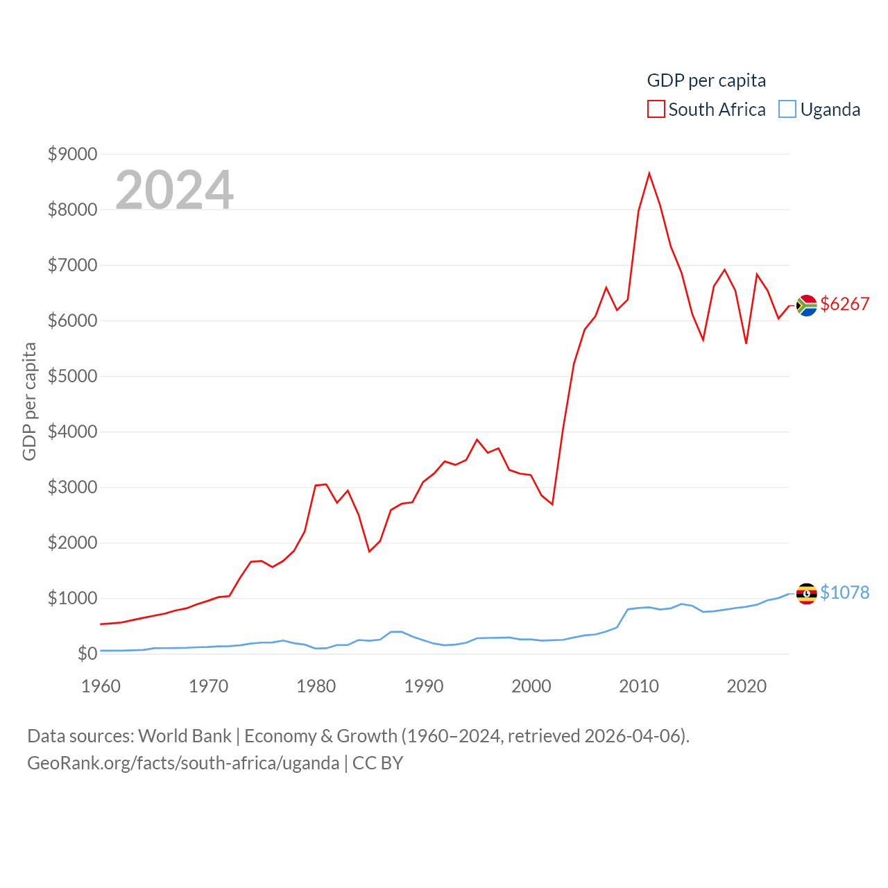 By GDP, South Africa ranks 40/197 ($401B) and Uganda ranks 89/197 ($53.9B). By GDP per capita, South Africa ranks 111/197 ($6,267), while Uganda ranks 176/197 ($1,078).