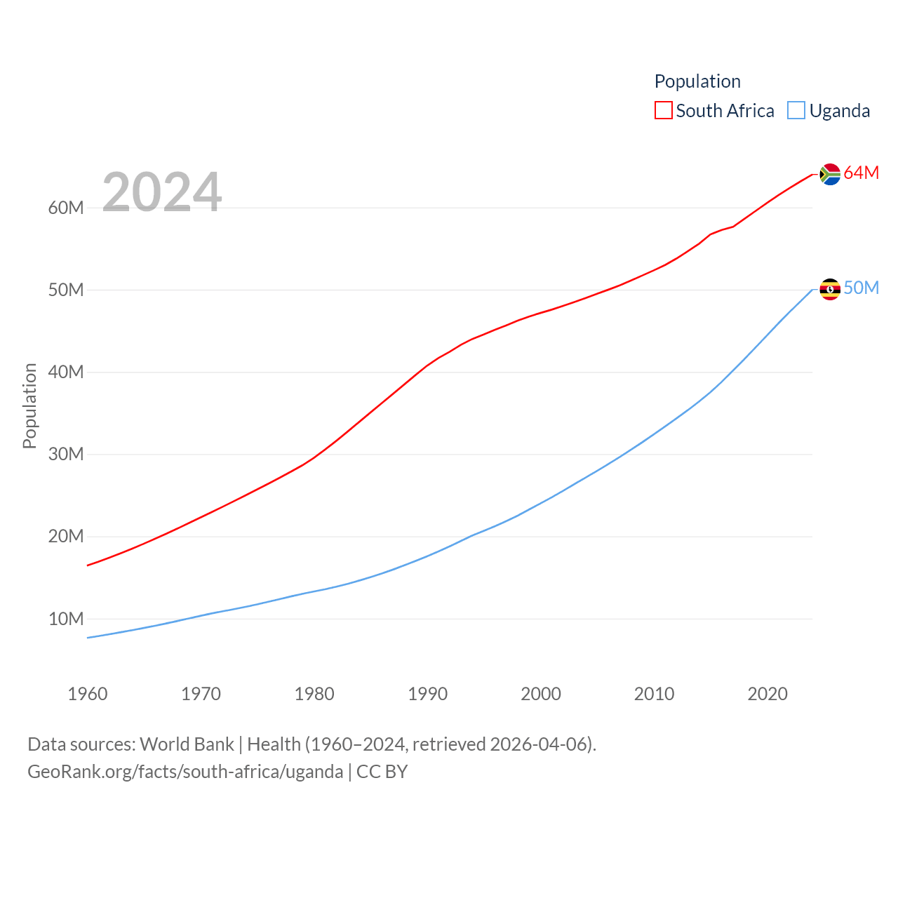 South Africa has a population of 64M (ranked 24/197), compared with 50M in Uganda (ranked 31/197). South Africa's land area is 468,377 sq mi versus 77,421 sq mi for Uganda (ranked 24th vs. 84th).