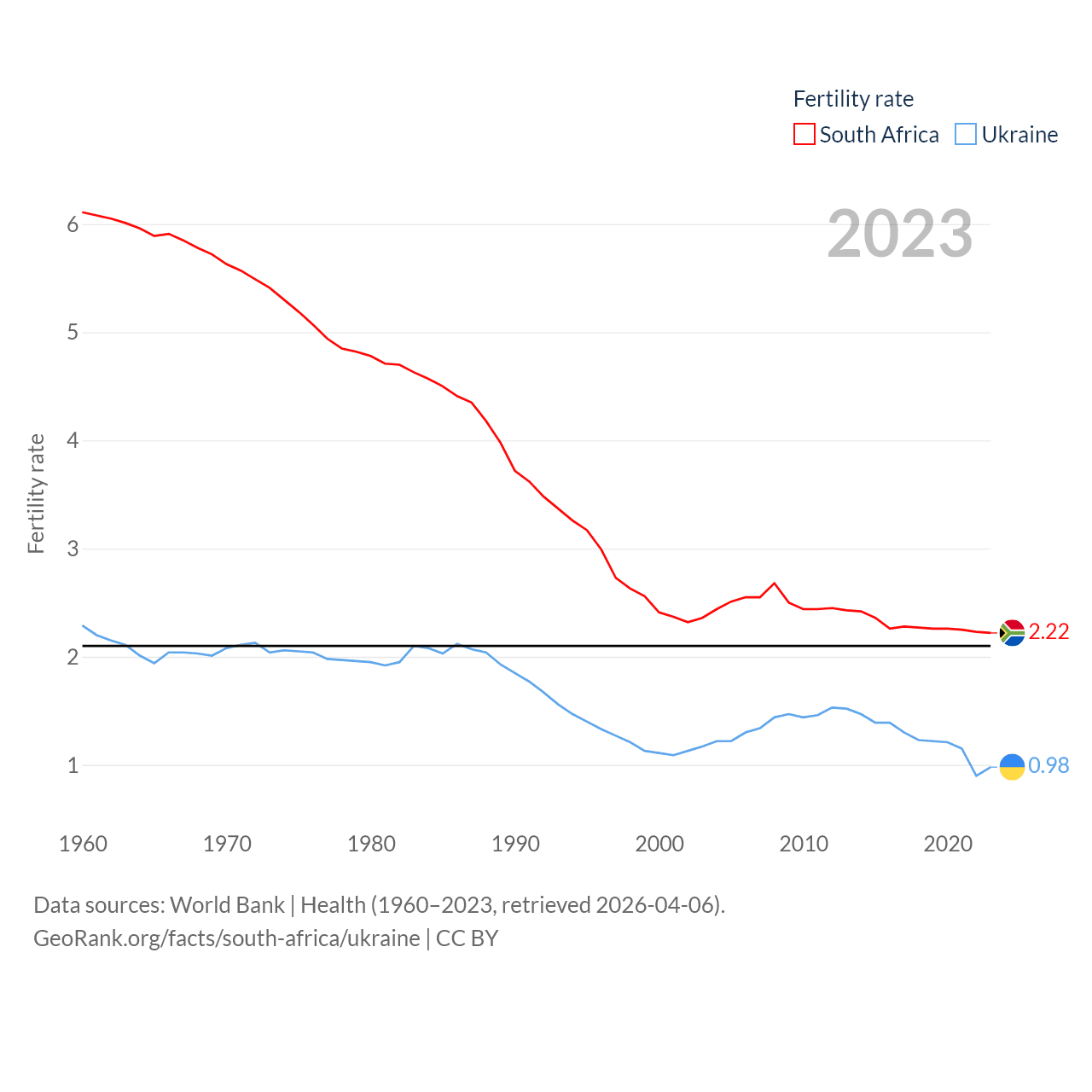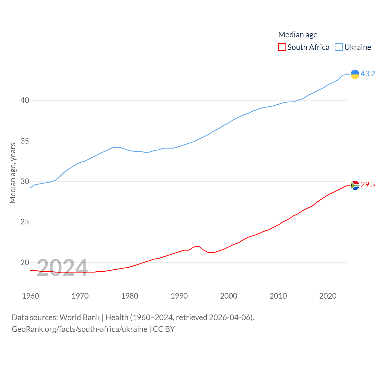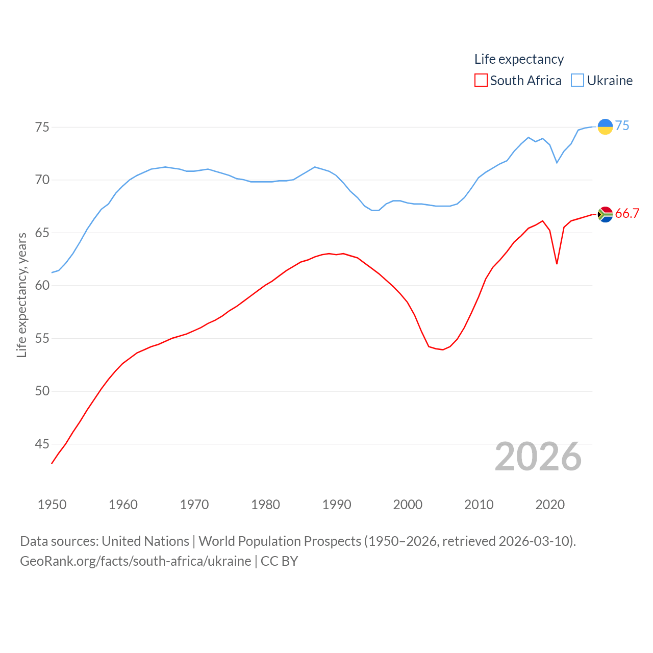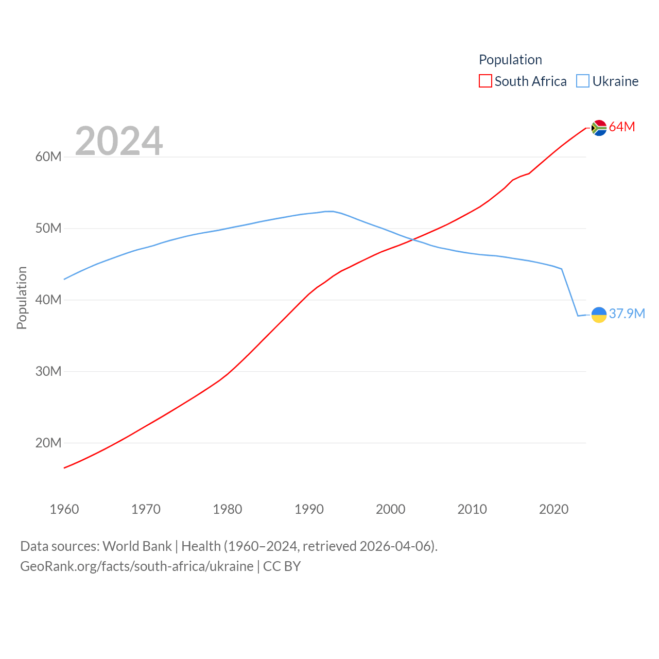 South Africa has a population of 64M (ranked 24/197), compared with 37.9M in Ukraine (ranked 41/197). South Africa's land area is 468,377 sq mi versus 223,708 sq mi for Ukraine (ranked 24th vs. 46th).