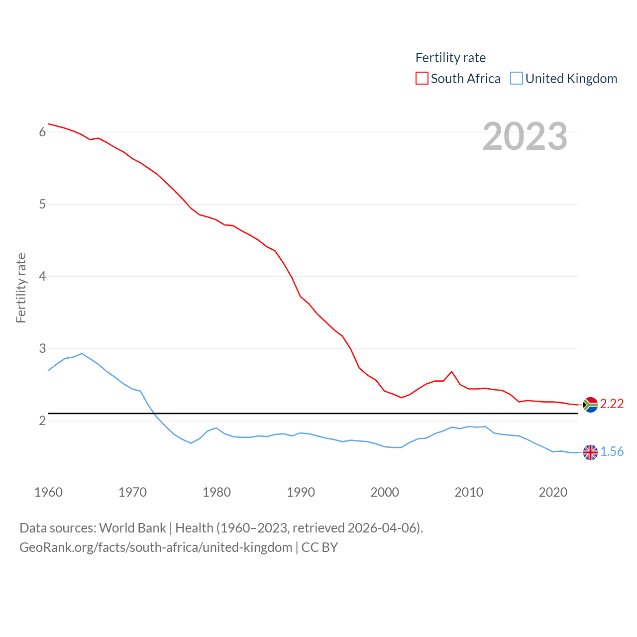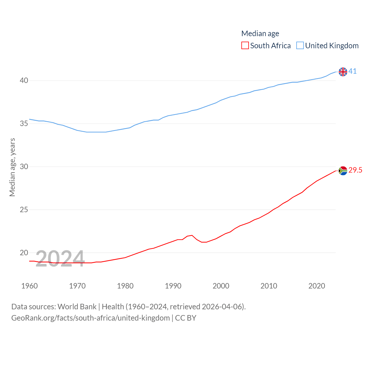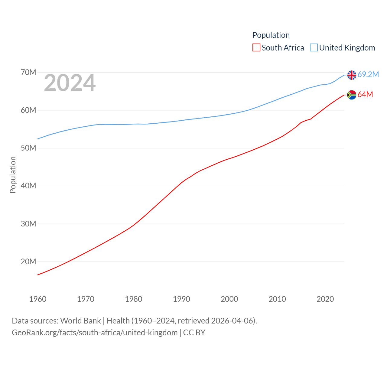 South Africa has a population of 64M (ranked 24/197), compared with 69.2M in The United Kingdom (ranked 21/197). South Africa's land area is 468,377 sq mi versus 93,410 sq mi for The United Kingdom (ranked 24th vs. 78th).