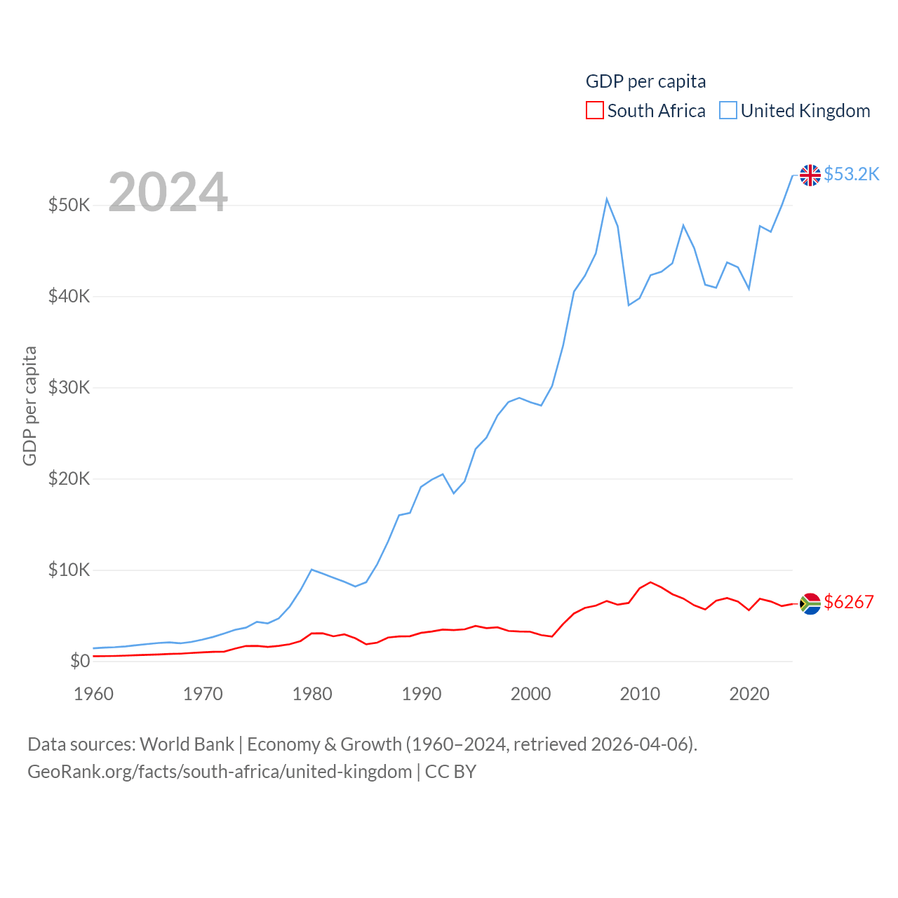 By GDP, South Africa ranks 40/197 ($401B) and The United Kingdom ranks 6/197 ($3.69T). By GDP per capita, South Africa ranks 111/197 ($6,267), while The United Kingdom ranks 22/197 ($53,246).