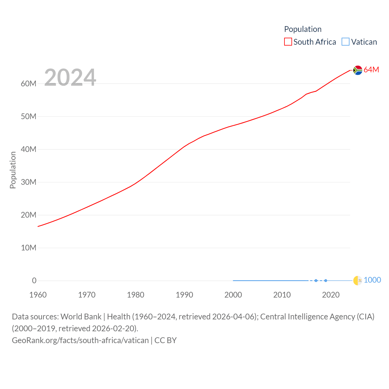 South Africa has a population of 64M (ranked 24/197), compared with 1K in The Vatican (ranked 197/197). South Africa's land area is 468,377 sq mi versus 0.17 sq mi for The Vatican (ranked 24th vs. 197th).