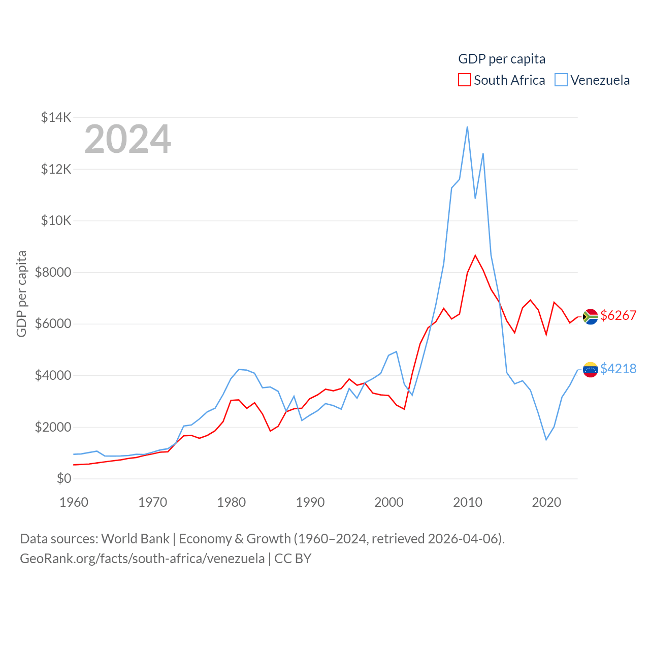 By GDP, South Africa ranks 40/197 ($401B) and Venezuela ranks 65/197 ($120B). By GDP per capita, South Africa ranks 111/197 ($6,267), while Venezuela ranks 128/197 ($4,218).