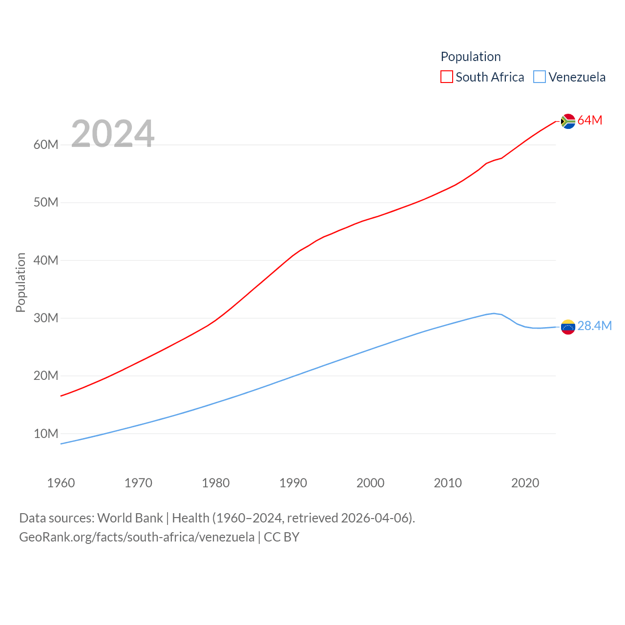 South Africa has a population of 64M (ranked 24/197), compared with 28.4M in Venezuela (ranked 53/197). South Africa's land area is 468,377 sq mi versus 340,561 sq mi for Venezuela (ranked 24th vs. 32nd).