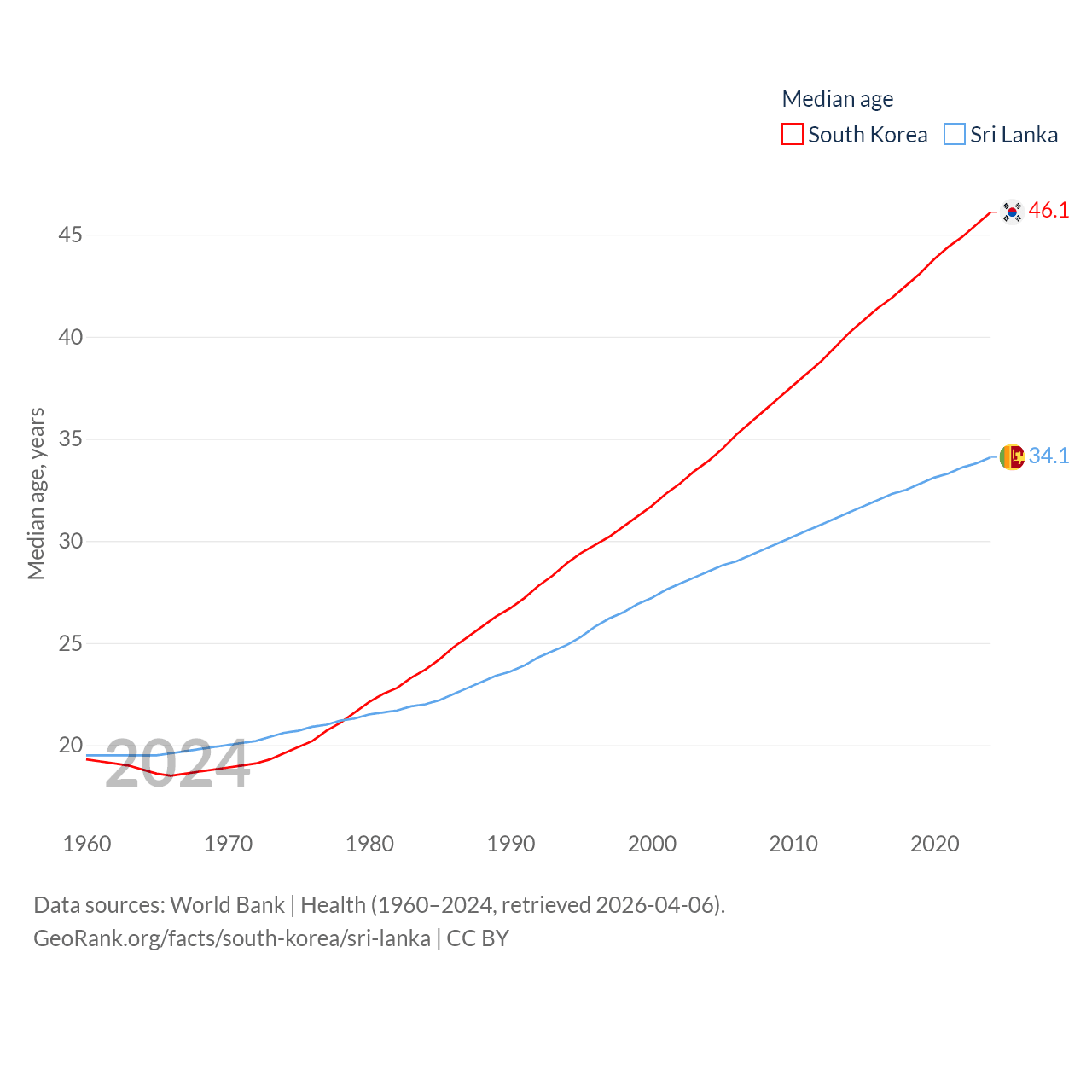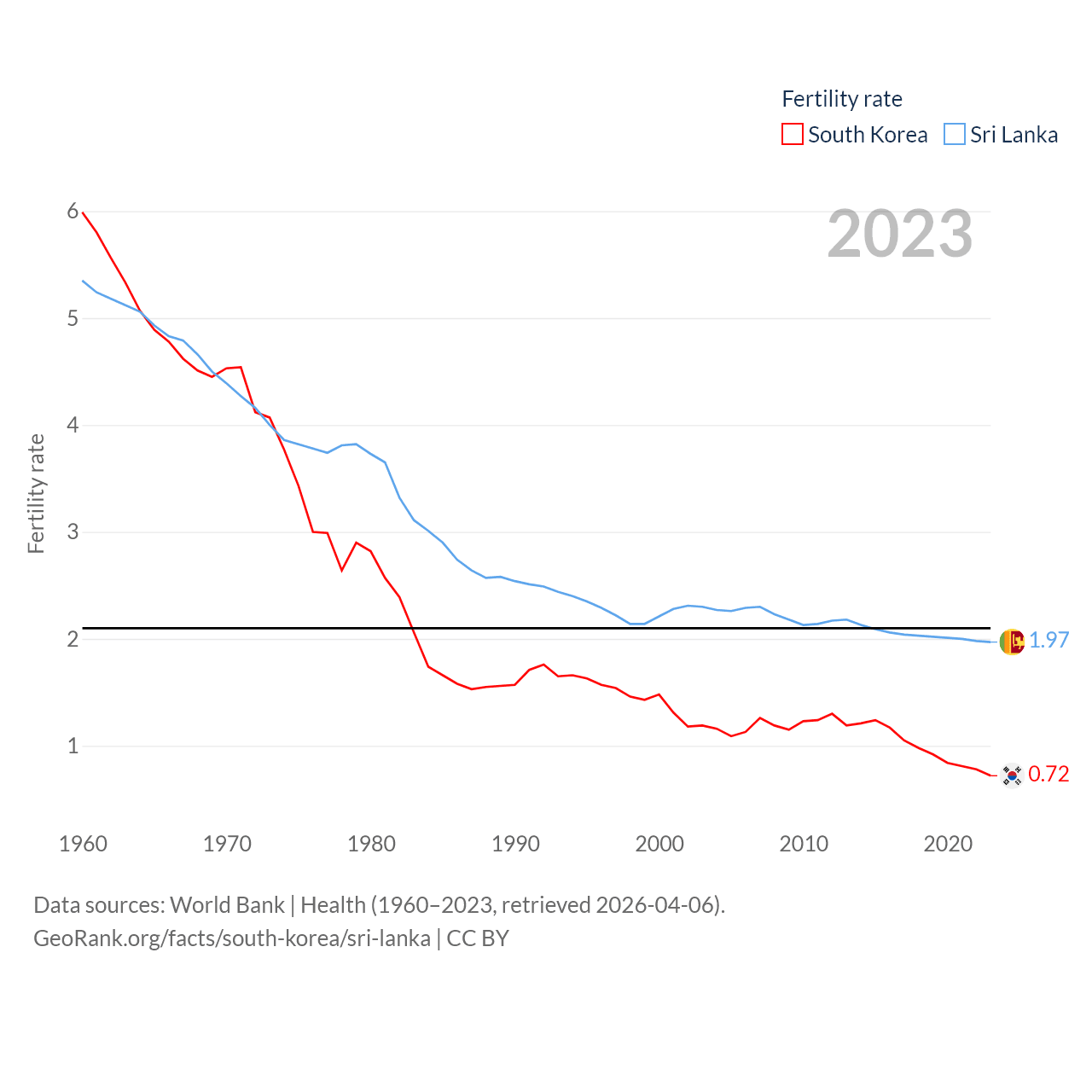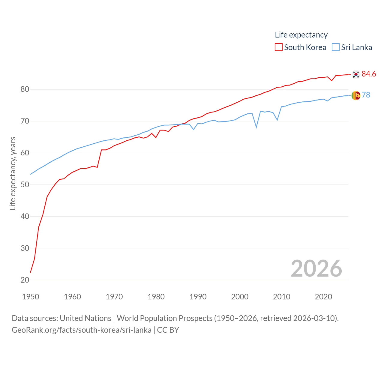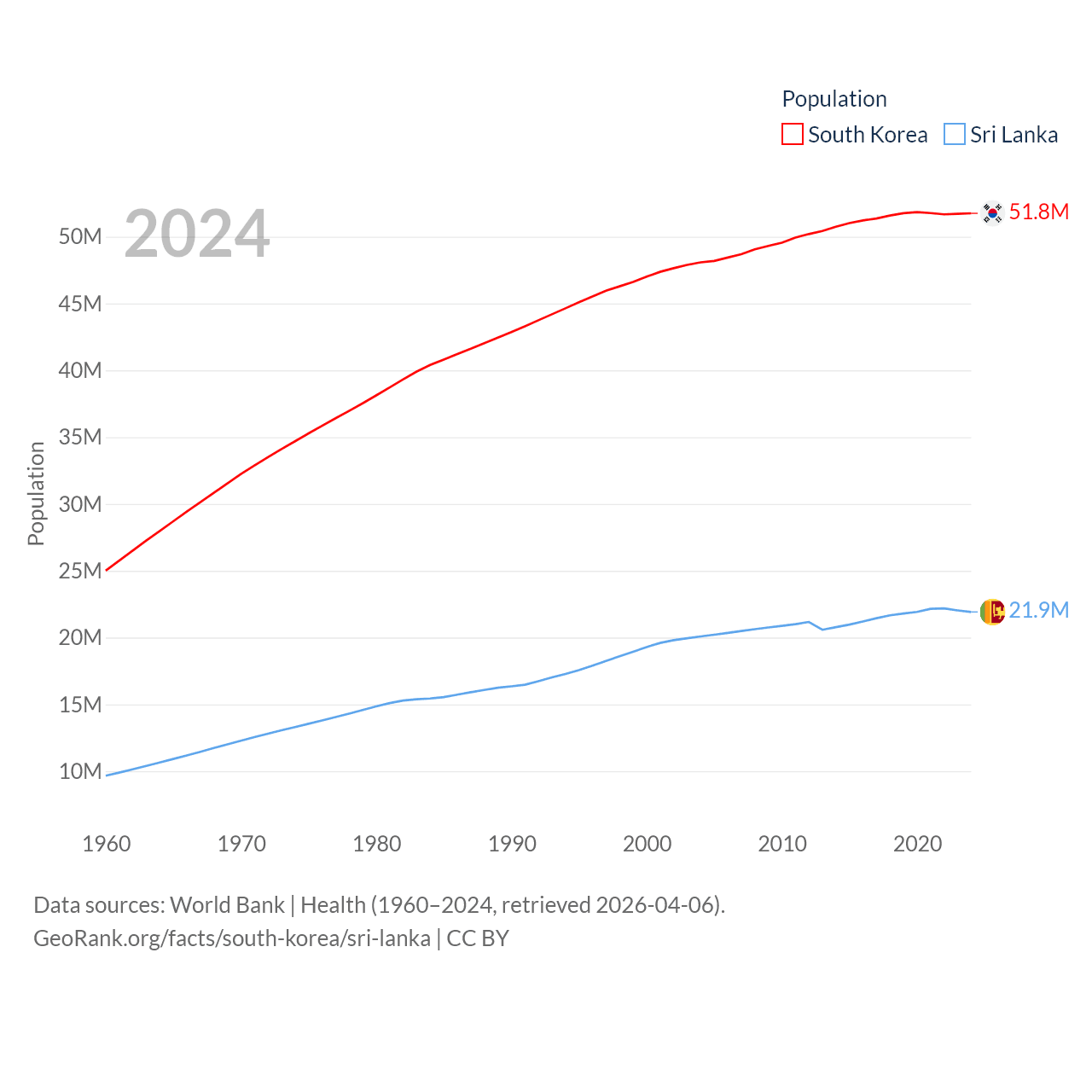 South Korea has a population of 51.8M (ranked 29/197), compared with 21.9M in Sri Lanka (ranked 61/197). South Korea's land area is 37,684 sq mi versus 23,884 sq mi for Sri Lanka (ranked 105th vs. 122nd).