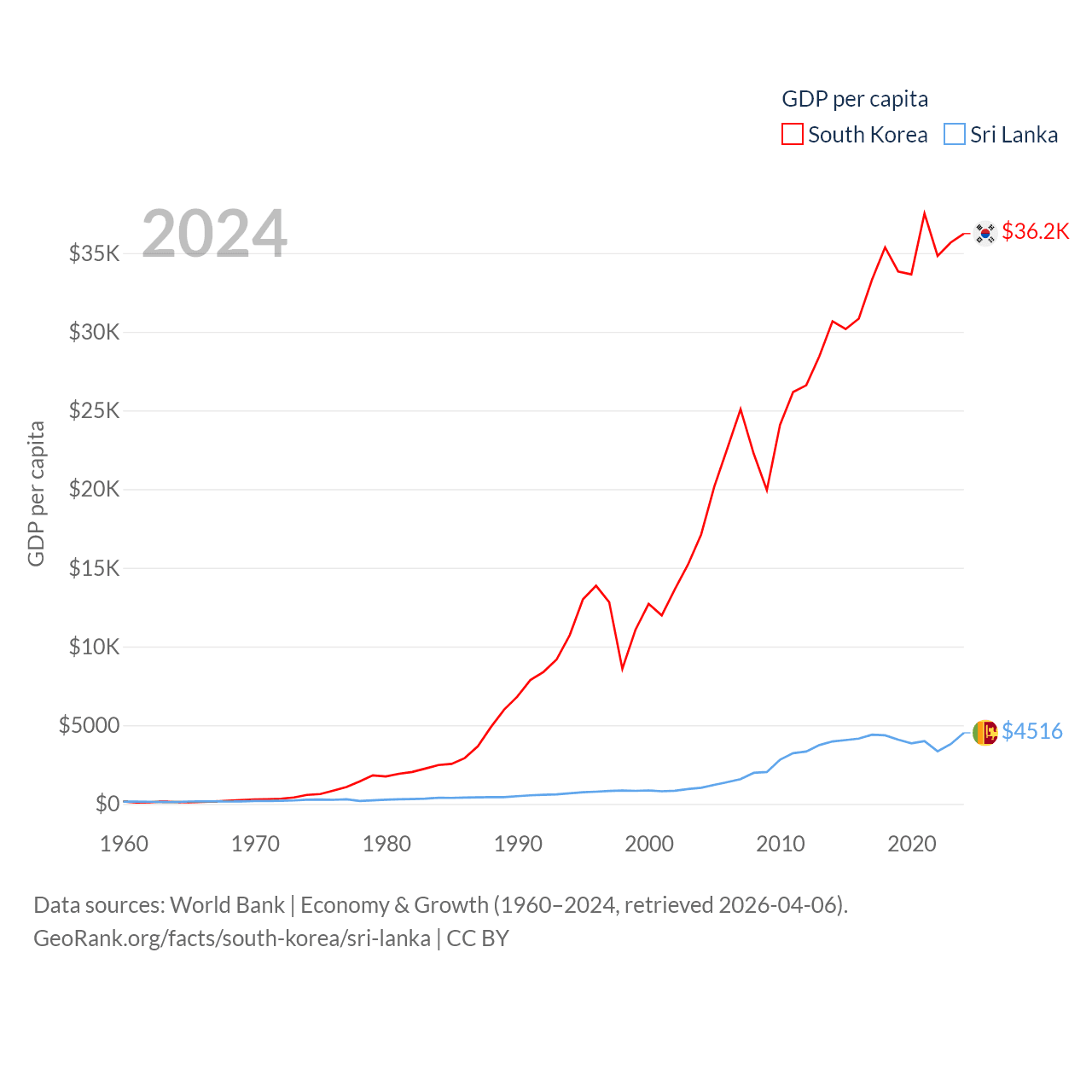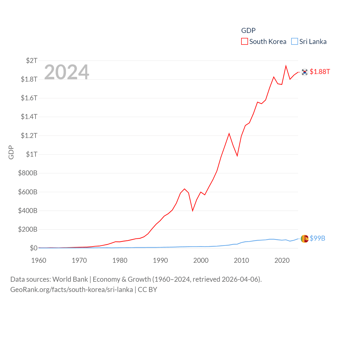 By GDP, South Korea ranks 12/197 ($1.88T) and Sri Lanka ranks 72/197 ($99B). By GDP per capita, South Korea ranks 31/197 ($36,239), while Sri Lanka ranks 124/197 ($4,516).