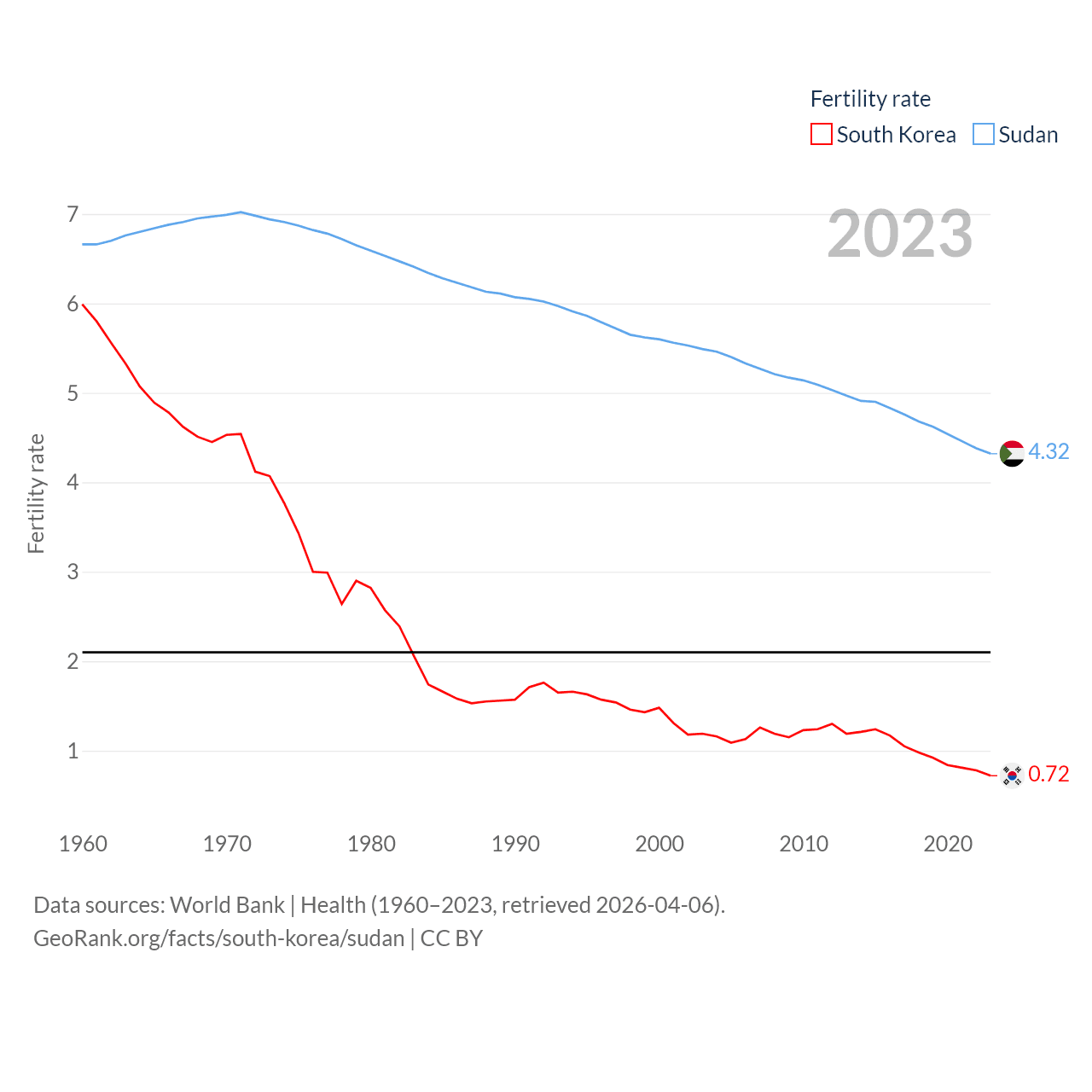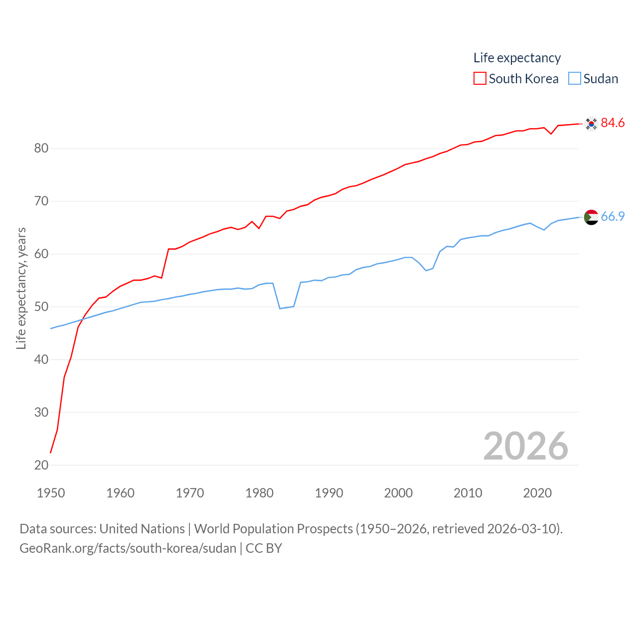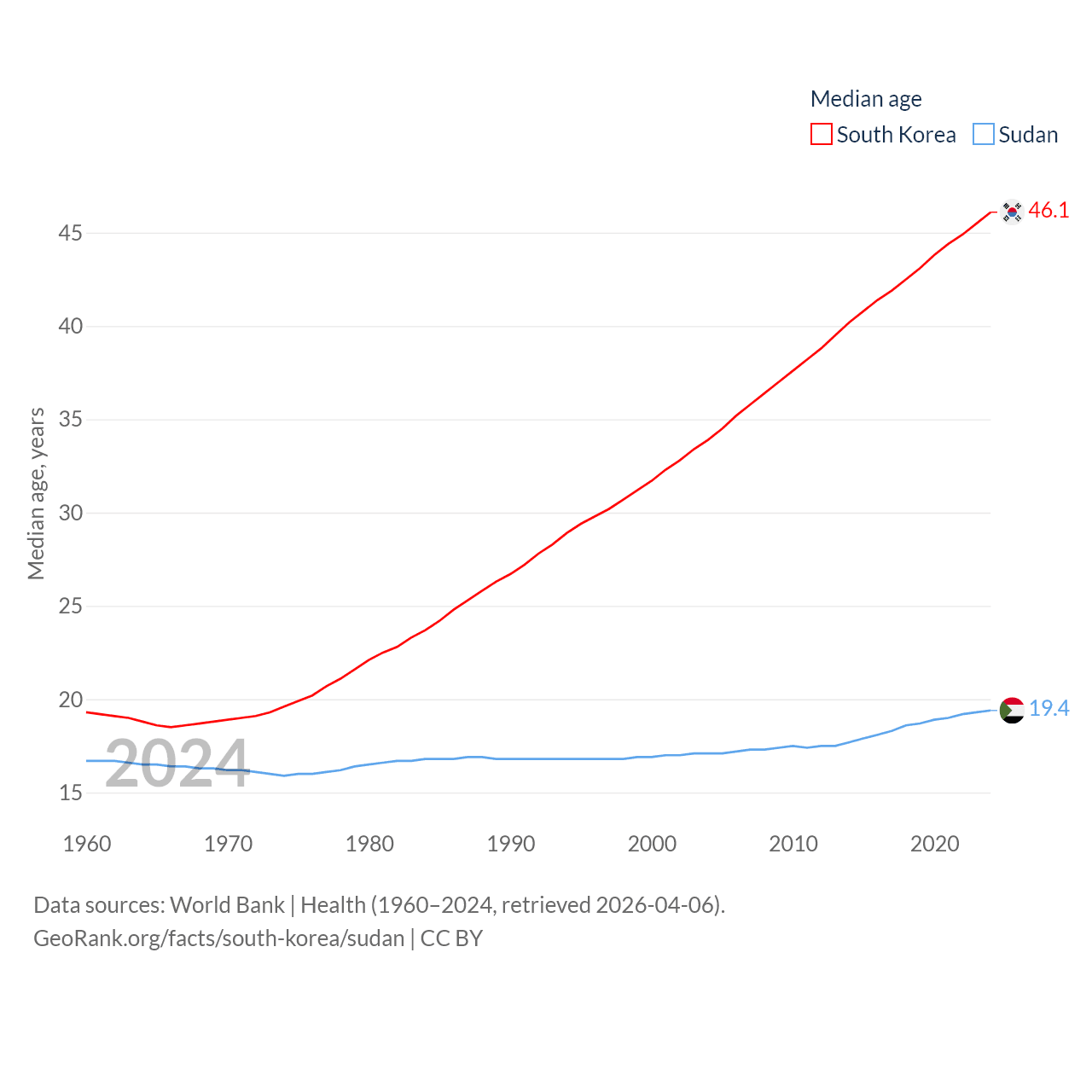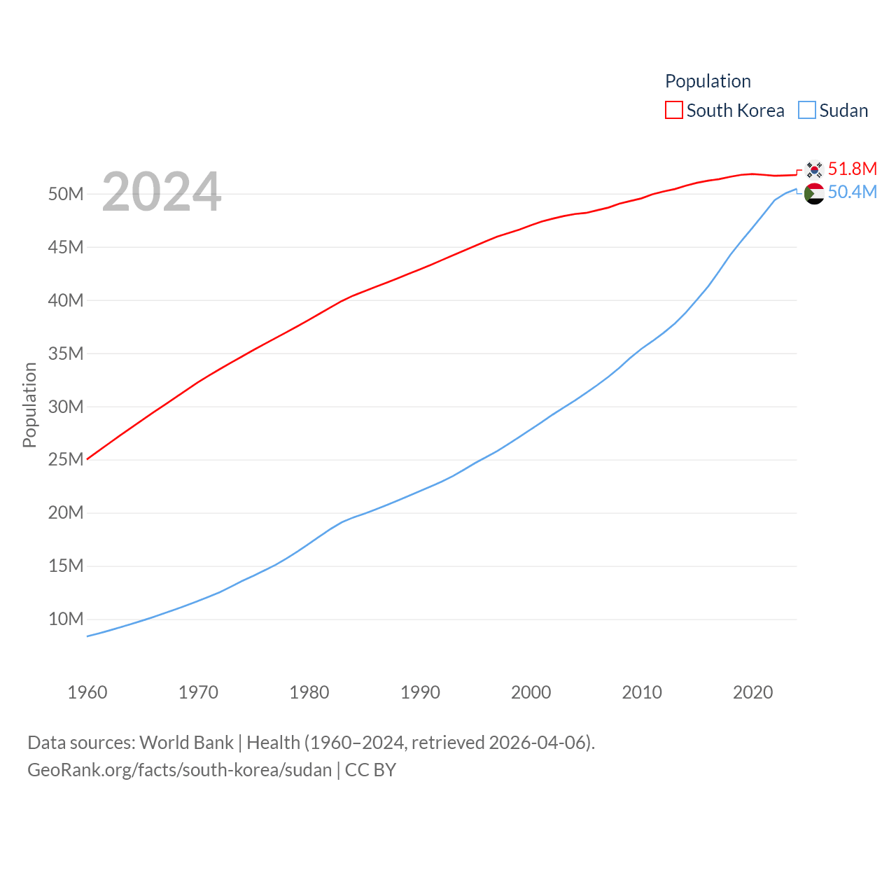 South Korea has a population of 51.8M (ranked 29/197), compared with 50.4M in Sudan (ranked 30/197). South Korea's land area is 37,684 sq mi versus 721,239 sq mi for Sudan (ranked 105th vs. 15th).