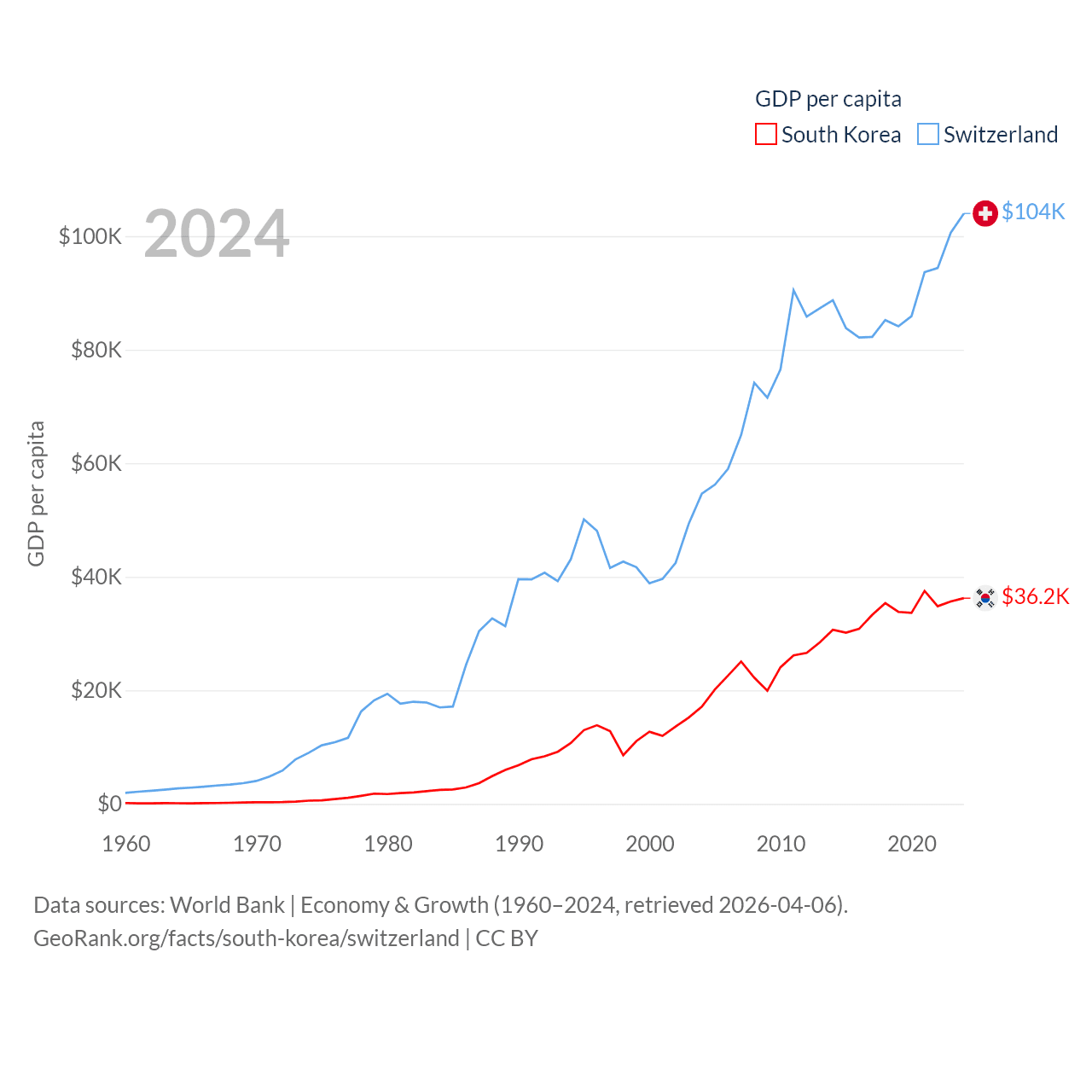 By GDP, South Korea ranks 12/197 ($1.88T) and Switzerland ranks 20/197 ($937B). By GDP per capita, South Korea ranks 31/197 ($36,239), while Switzerland ranks 5/197 ($103,998).