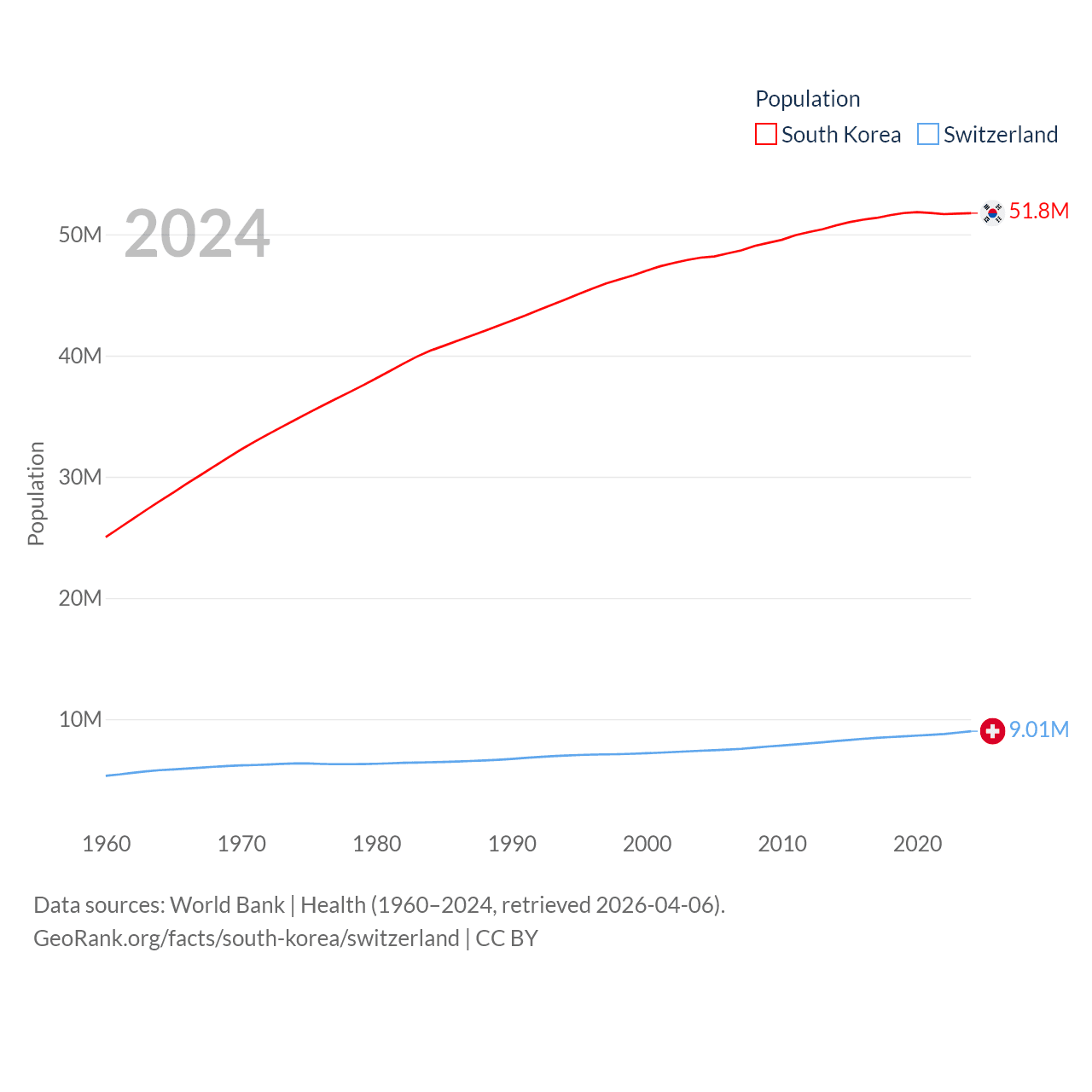 South Korea has a population of 51.8M (ranked 29/197), compared with 9.01M in Switzerland (ranked 101/197). South Korea's land area is 37,684 sq mi versus 15,255 sq mi for Switzerland (ranked 105th vs. 131st).