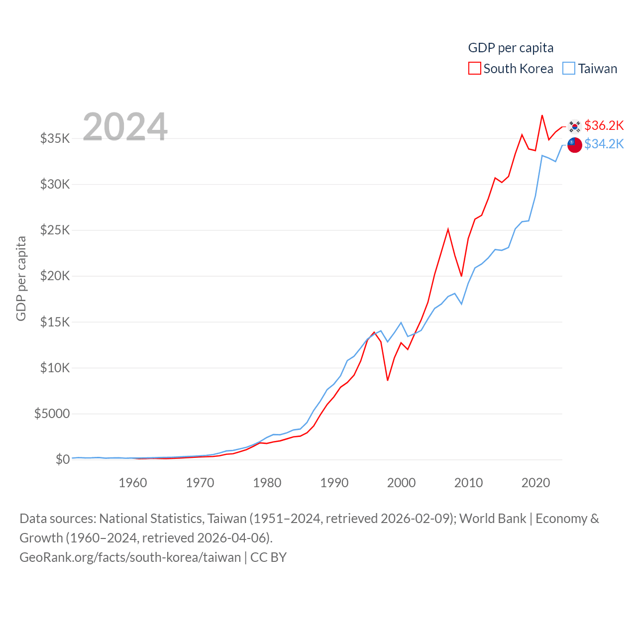 By GDP, South Korea ranks 12/197 ($1.88T) and Taiwan ranks 22/197 ($802B). By GDP per capita, South Korea ranks 31/197 ($36,239), while Taiwan ranks 35/197 ($34,238).