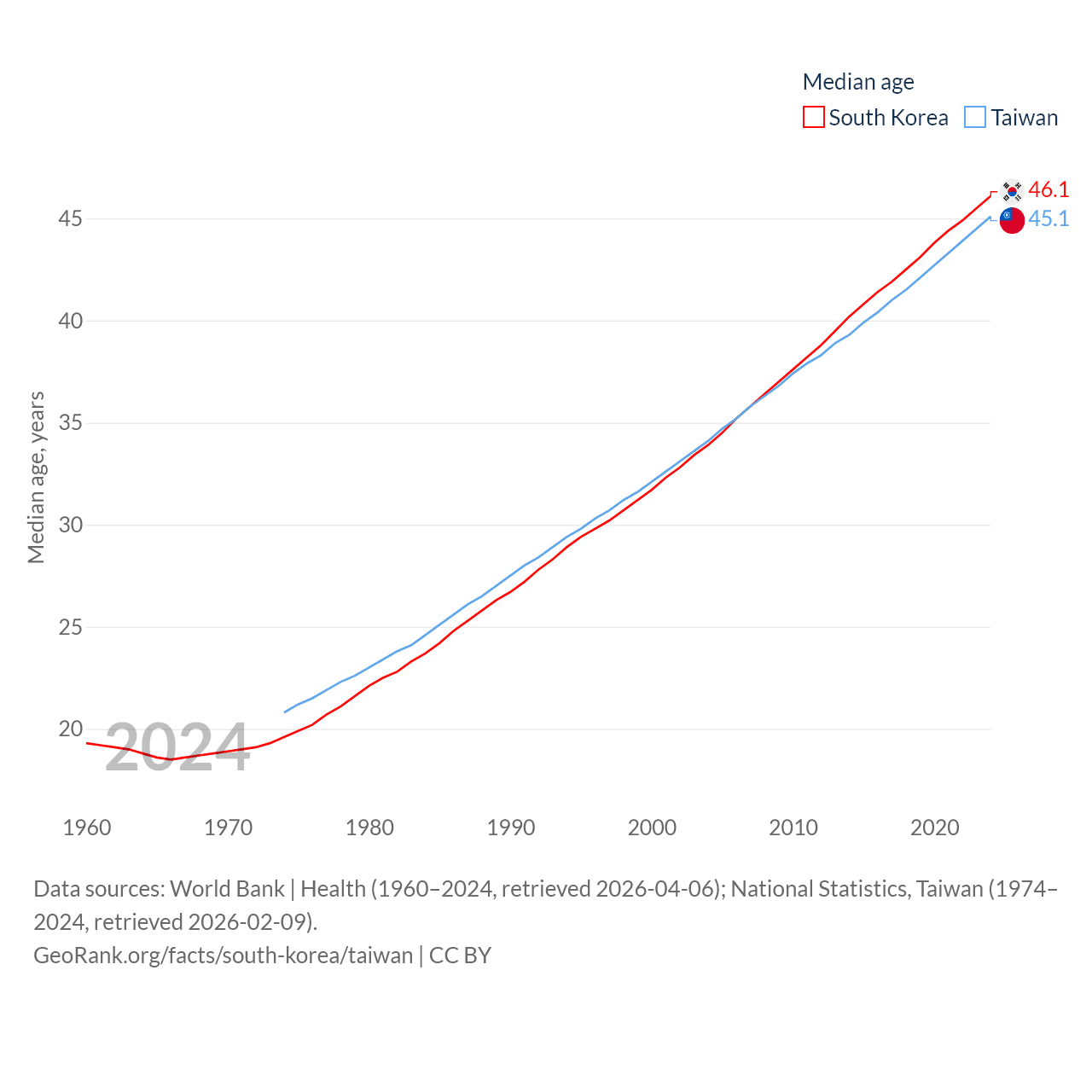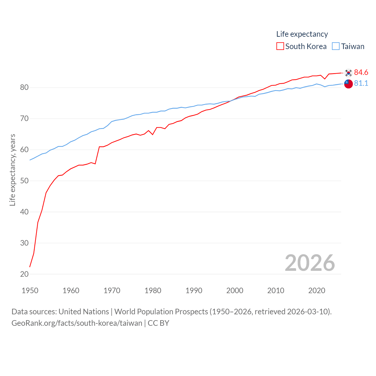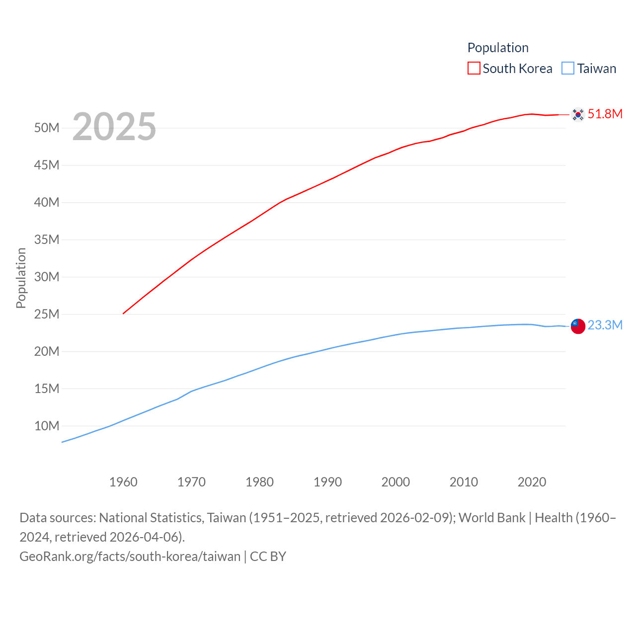 South Korea has a population of 51.8M (ranked 29/197), compared with 23.3M in Taiwan (ranked 60/197). South Korea's land area is 37,684 sq mi versus 13,976 sq mi for Taiwan (ranked 105th vs. 133rd).