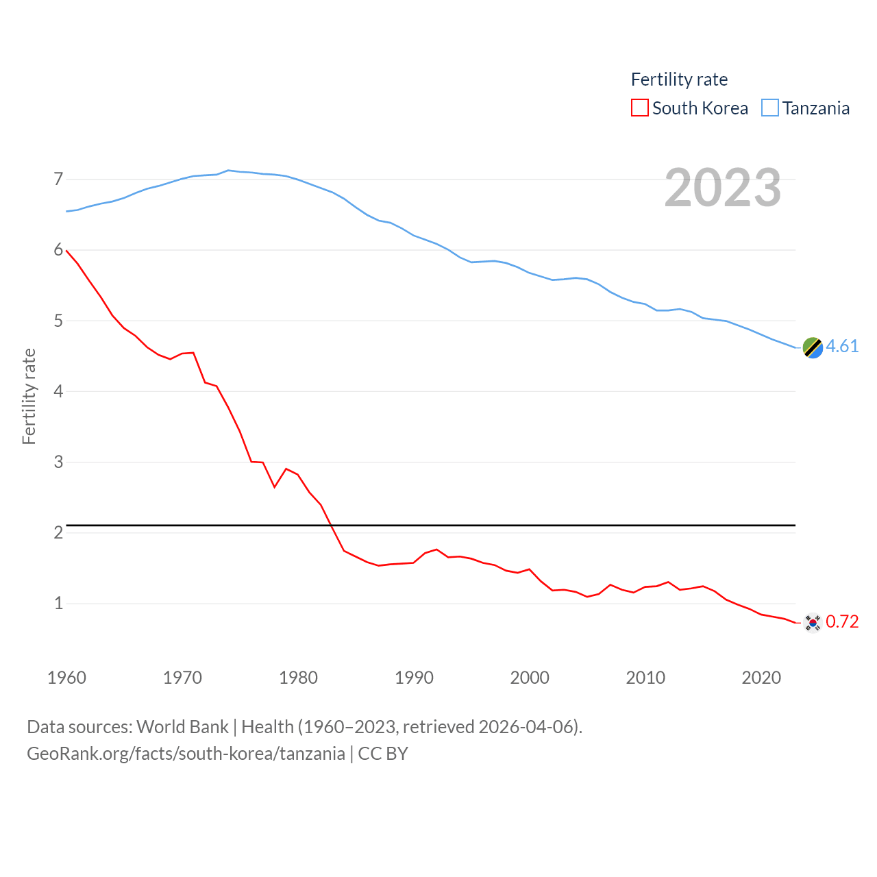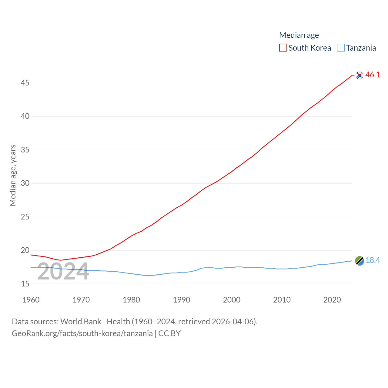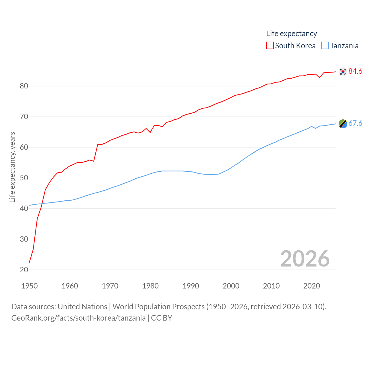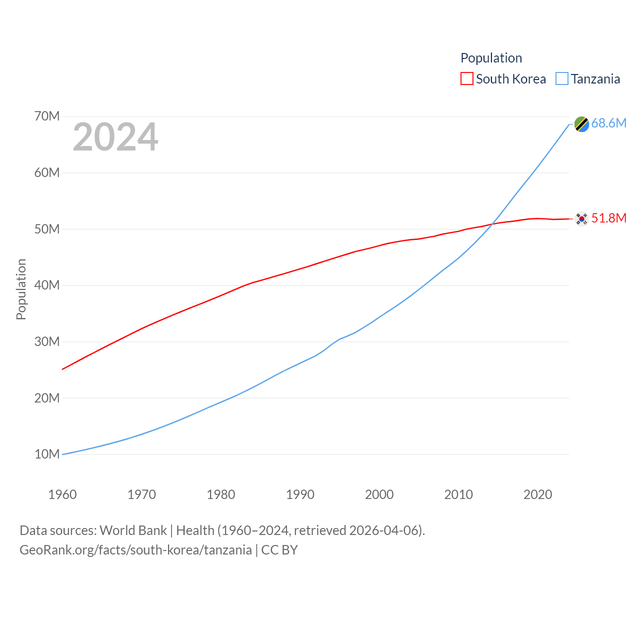 South Korea has a population of 51.8M (ranked 29/197), compared with 68.6M in Tanzania (ranked 22/197). South Korea's land area is 37,684 sq mi versus 342,009 sq mi for Tanzania (ranked 105th vs. 31st).