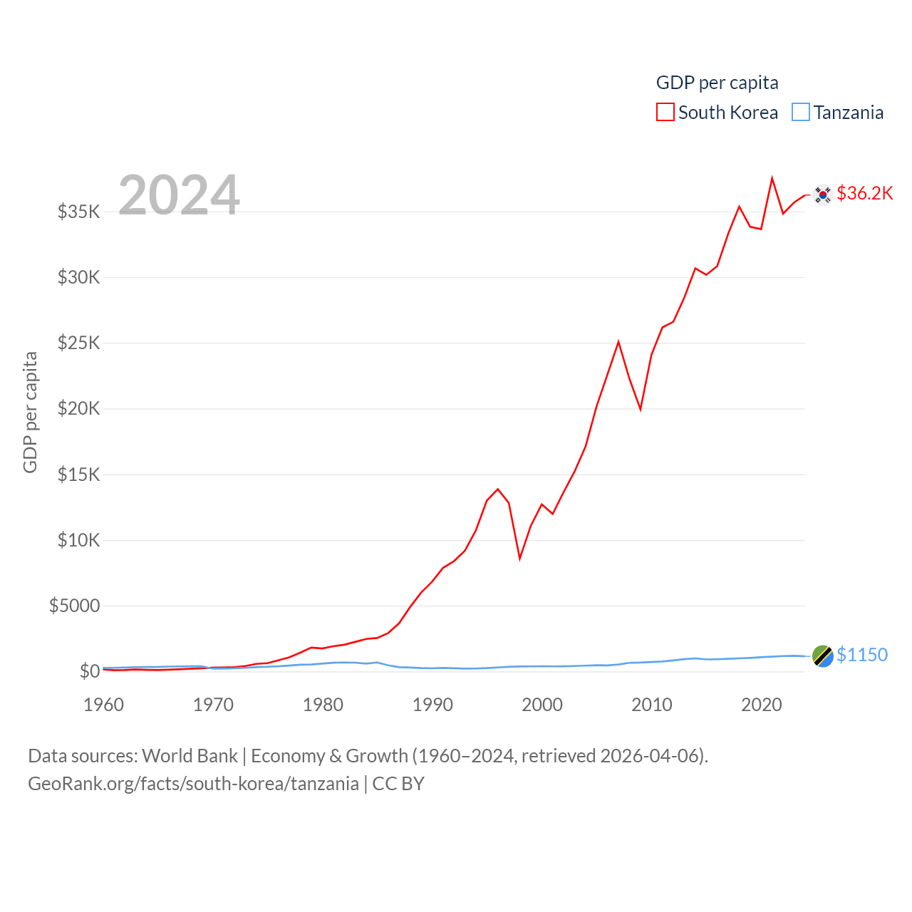By GDP, South Korea ranks 12/197 ($1.88T) and Tanzania ranks 82/197 ($78.8B). By GDP per capita, South Korea ranks 31/197 ($36,239), while Tanzania ranks 170/197 ($1,150).