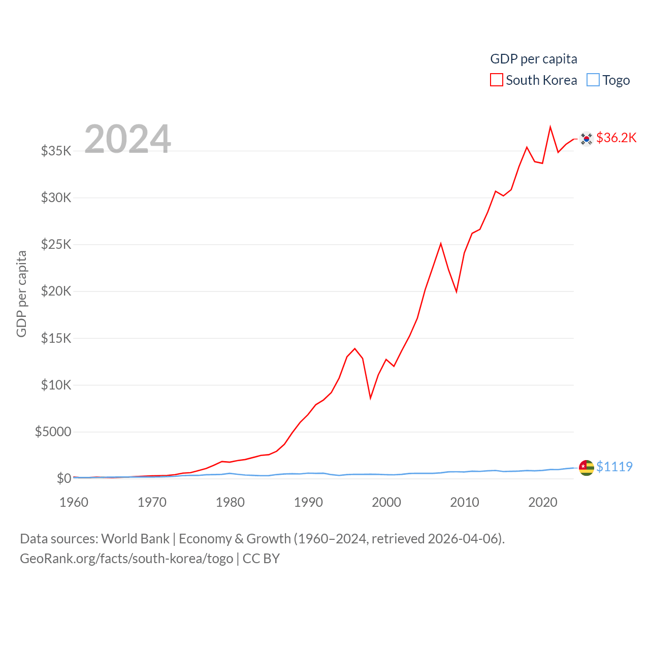 By GDP, South Korea ranks 12/197 ($1.88T) and Togo ranks 154/197 ($10.7B). By GDP per capita, South Korea ranks 31/197 ($36,239), while Togo ranks 172/197 ($1,119).