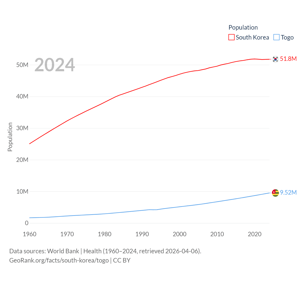South Korea has a population of 51.8M (ranked 29/197), compared with 9.52M in Togo (ranked 98/197). South Korea's land area is 37,684 sq mi versus 21,000 sq mi for Togo (ranked 105th vs. 124th).