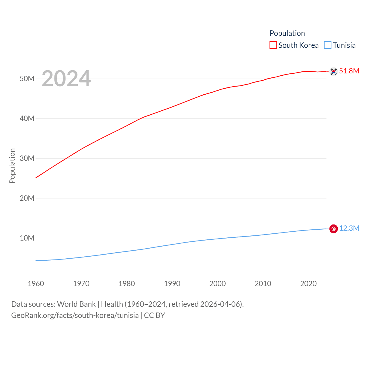 South Korea has a population of 51.8M (ranked 29/197), compared with 12.3M in Tunisia (ranked 80/197). South Korea's land area is 37,684 sq mi versus 59,985 sq mi for Tunisia (ranked 105th vs. 91st).