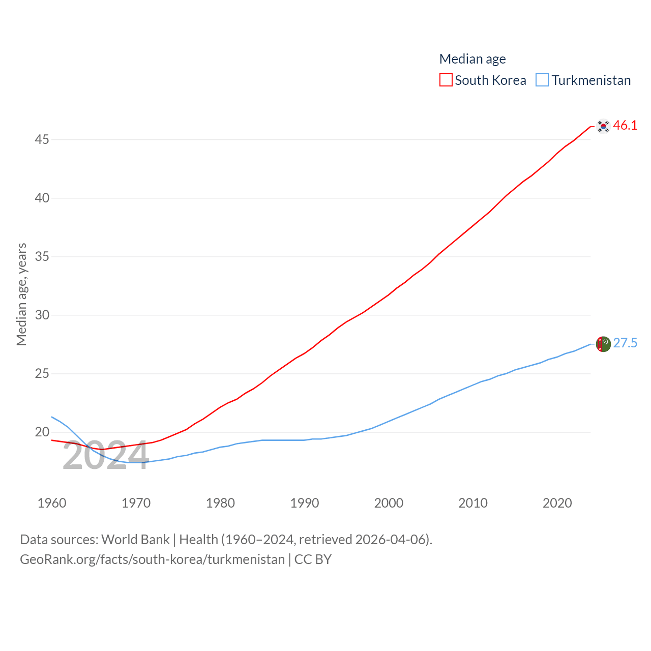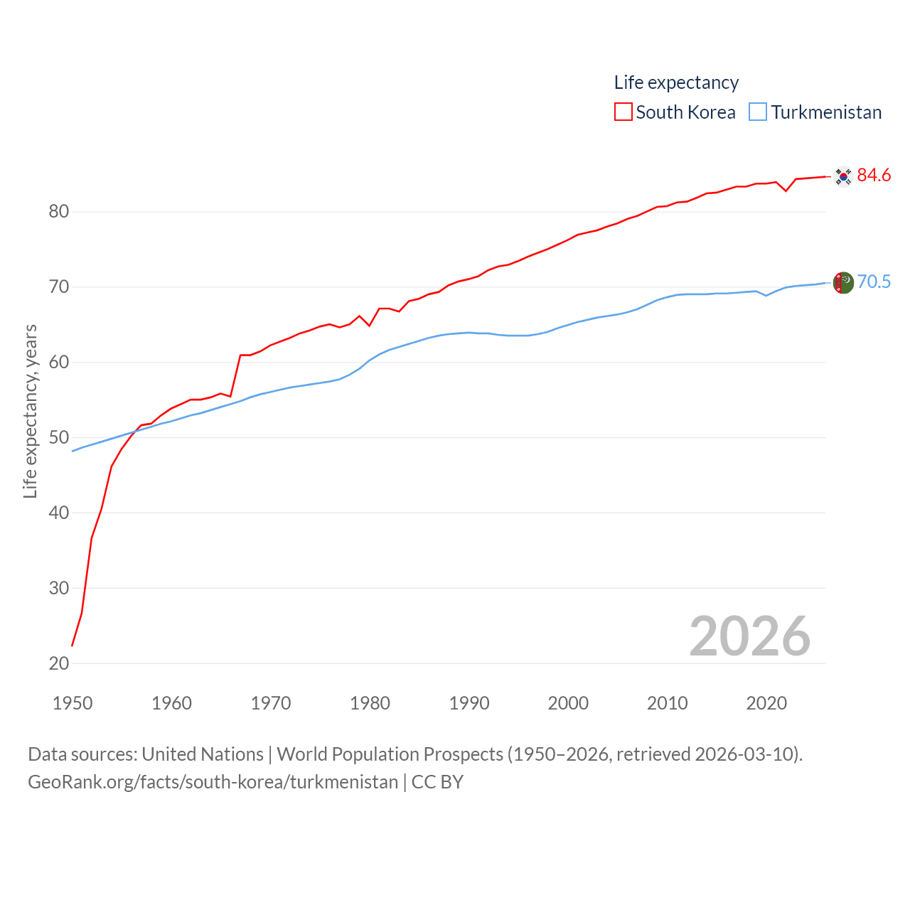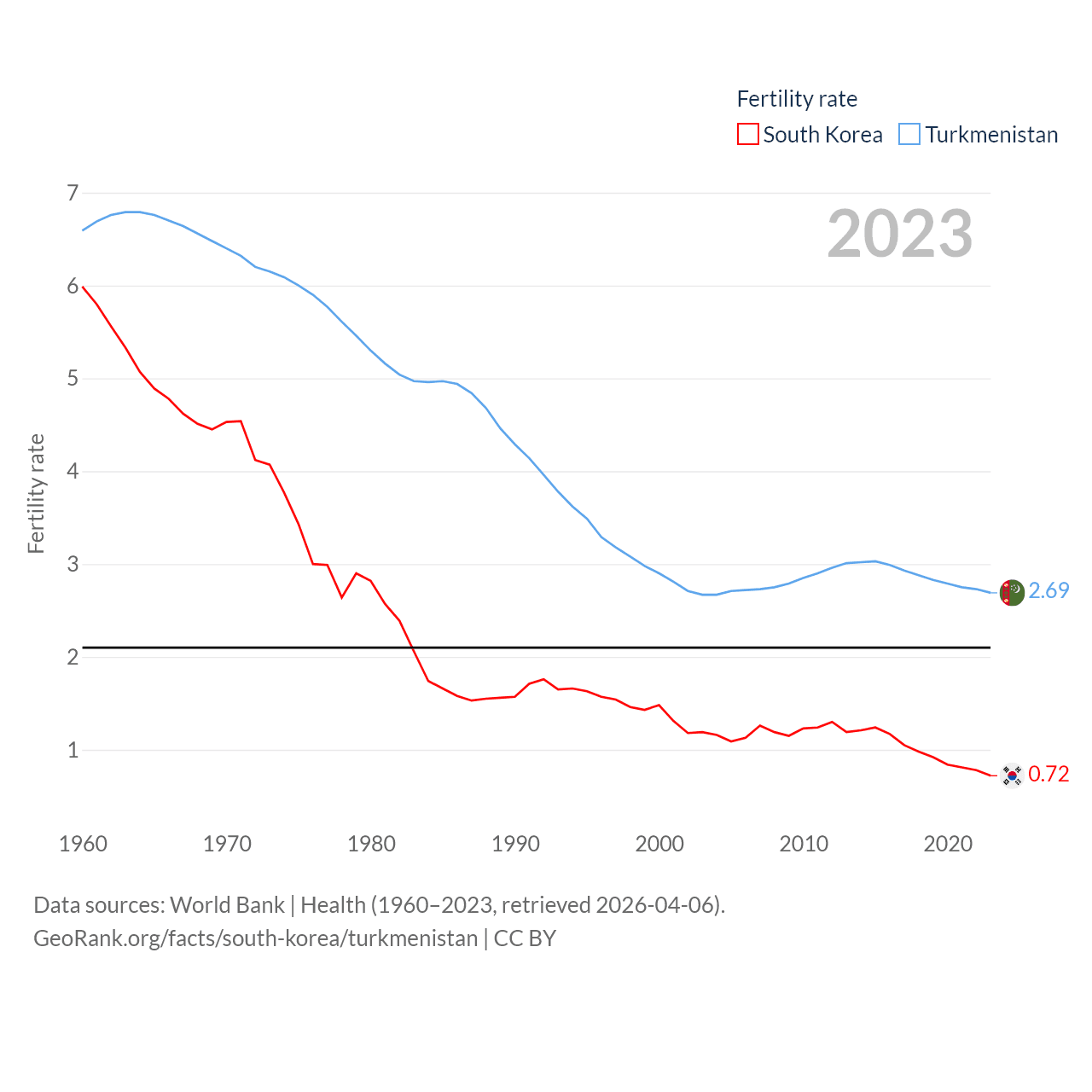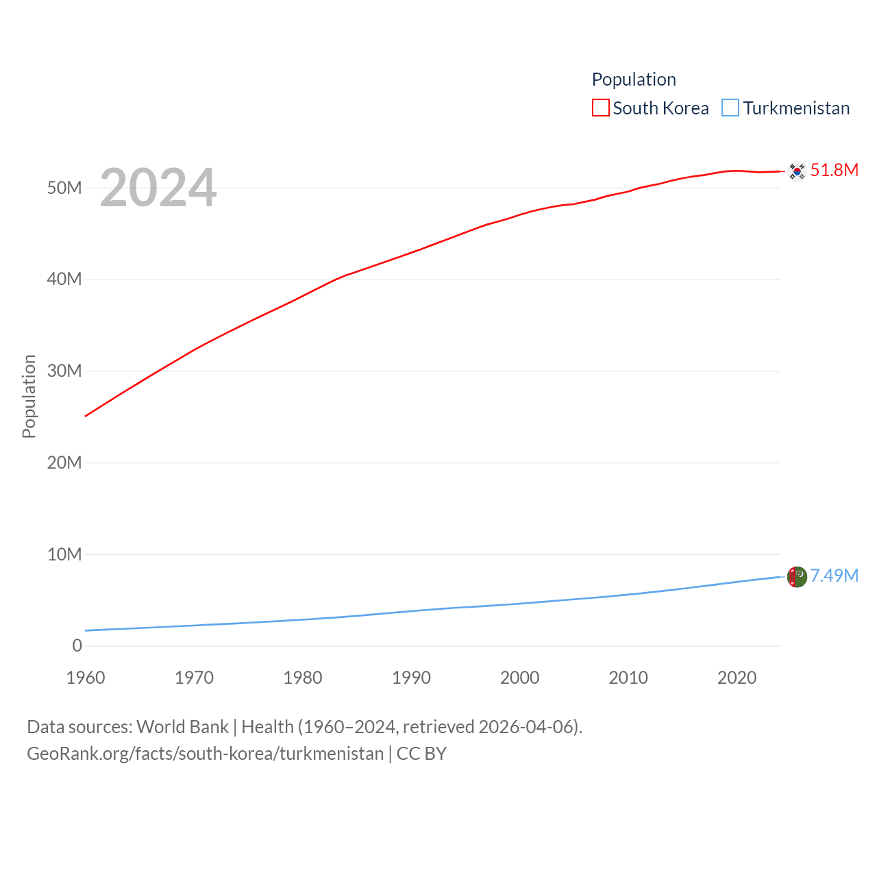 South Korea has a population of 51.8M (ranked 29/197), compared with 7.49M in Turkmenistan (ranked 104/197). South Korea's land area is 37,684 sq mi versus 181,441 sq mi for Turkmenistan (ranked 105th vs. 53rd).