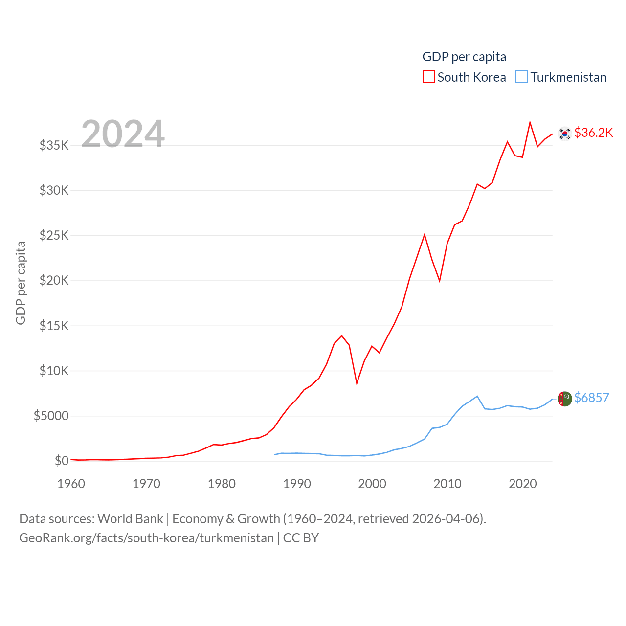 By GDP, South Korea ranks 12/197 ($1.88T) and Turkmenistan ranks 92/197 ($51.4B). By GDP per capita, South Korea ranks 31/197 ($36,239), while Turkmenistan ranks 104/197 ($6,857).