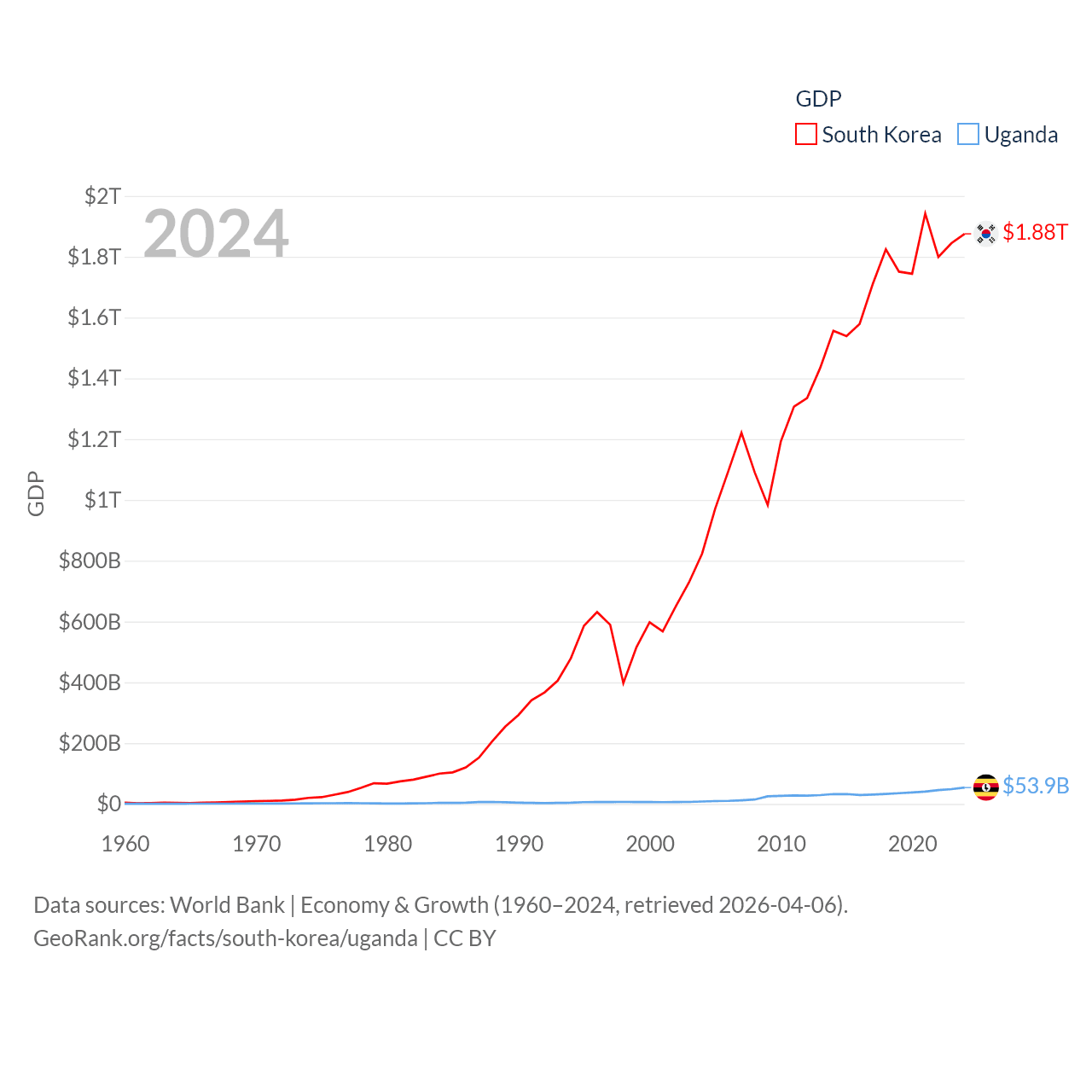 By GDP, South Korea ranks 12/197 ($1.88T) and Uganda ranks 89/197 ($53.9B). By GDP per capita, South Korea ranks 31/197 ($36,239), while Uganda ranks 176/197 ($1,078).