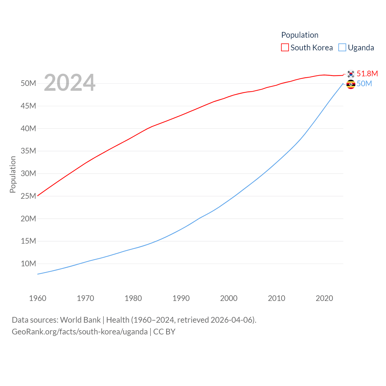 South Korea has a population of 51.8M (ranked 29/197), compared with 50M in Uganda (ranked 31/197). South Korea's land area is 37,684 sq mi versus 77,421 sq mi for Uganda (ranked 105th vs. 84th).