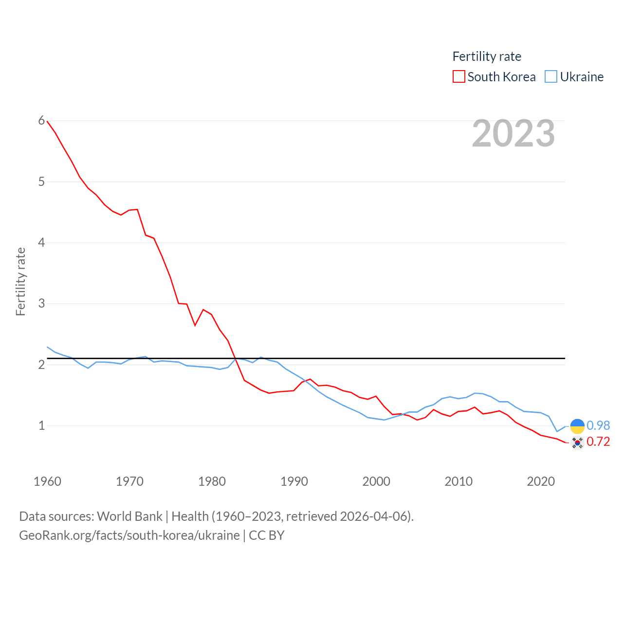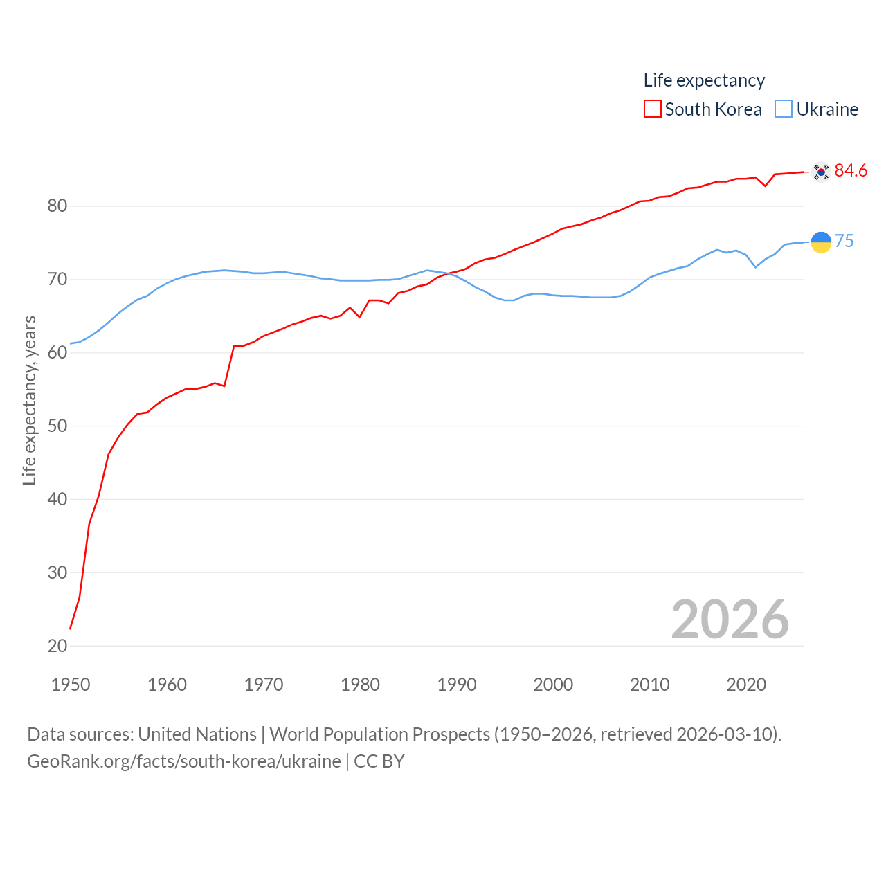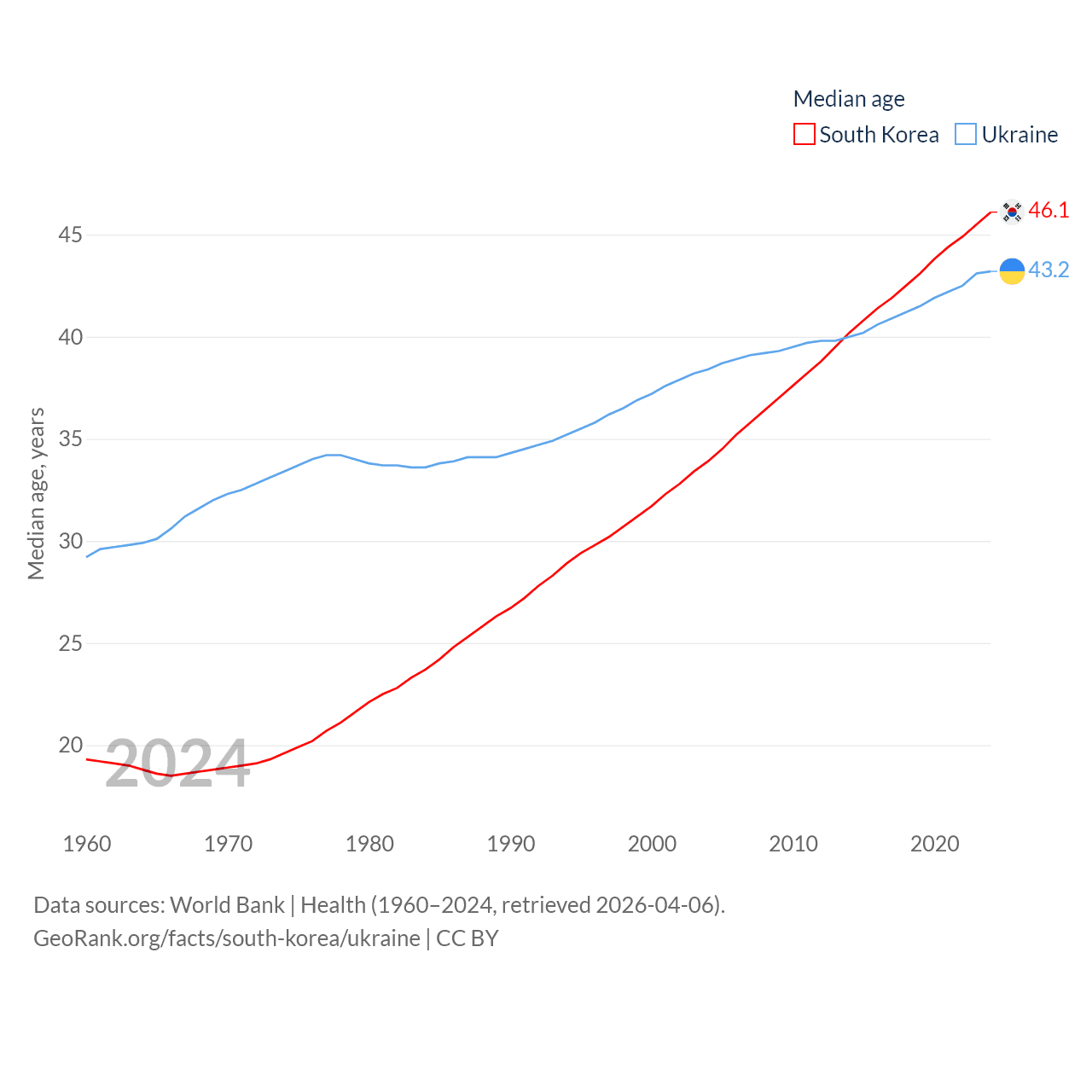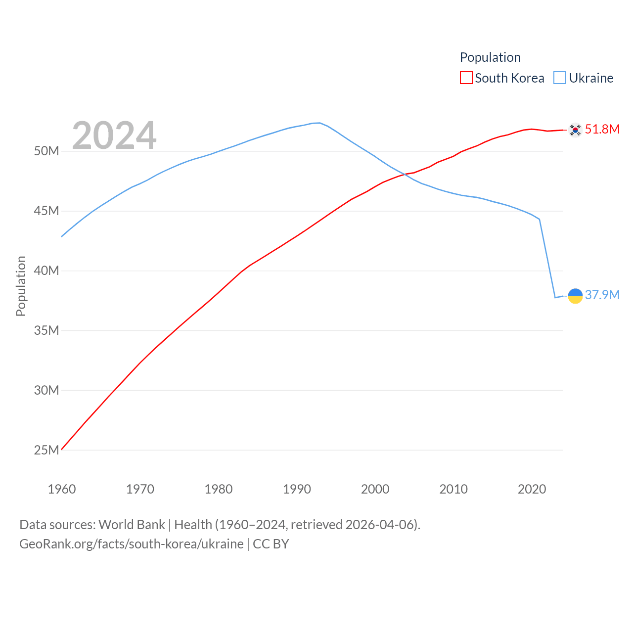 South Korea has a population of 51.8M (ranked 29/197), compared with 37.9M in Ukraine (ranked 41/197). South Korea's land area is 37,684 sq mi versus 223,708 sq mi for Ukraine (ranked 105th vs. 46th).