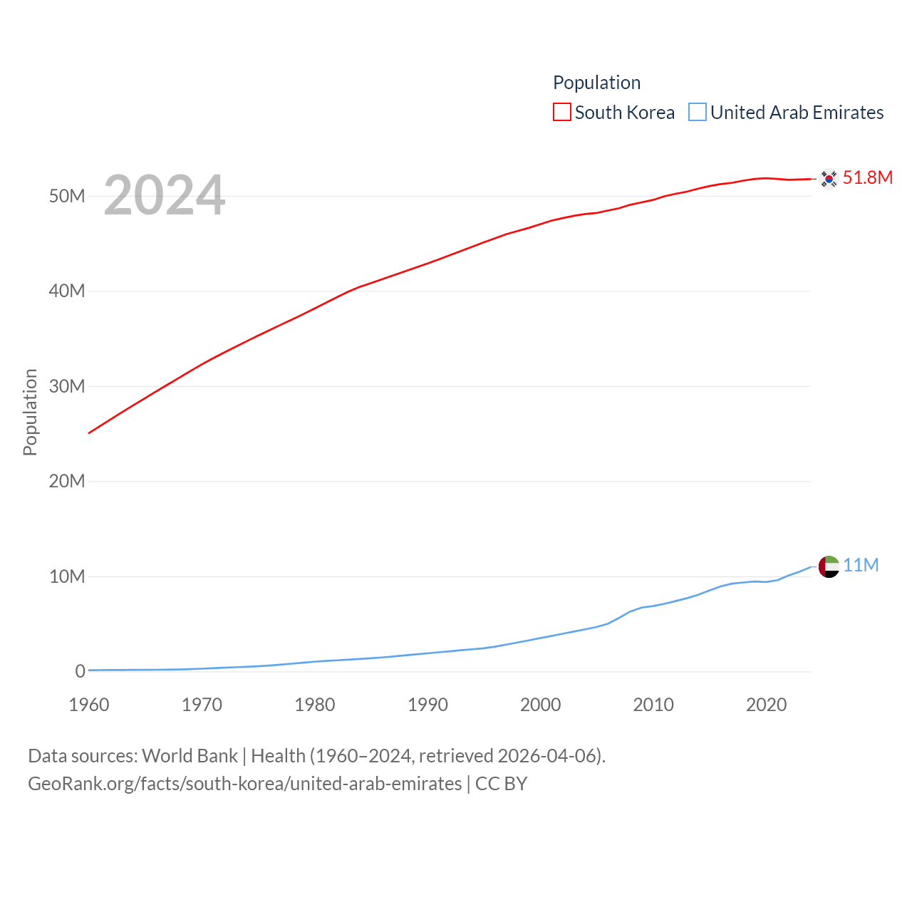 South Korea has a population of 51.8M (ranked 29/197), compared with 11M in The United Arab Emirates (ranked 86/197). South Korea's land area is 37,684 sq mi versus 27,421 sq mi for The United Arab Emirates (ranked 105th vs. 117th).