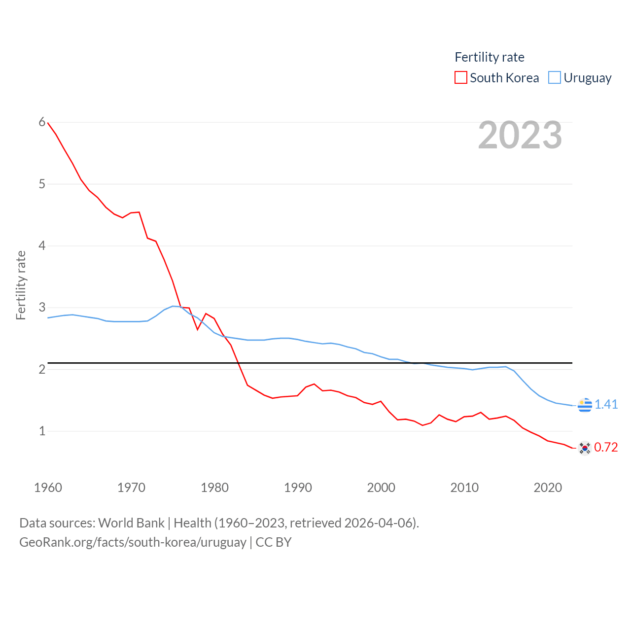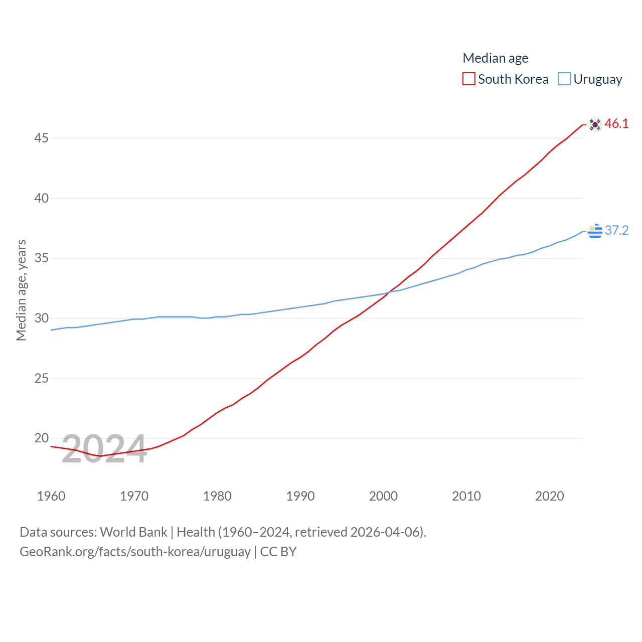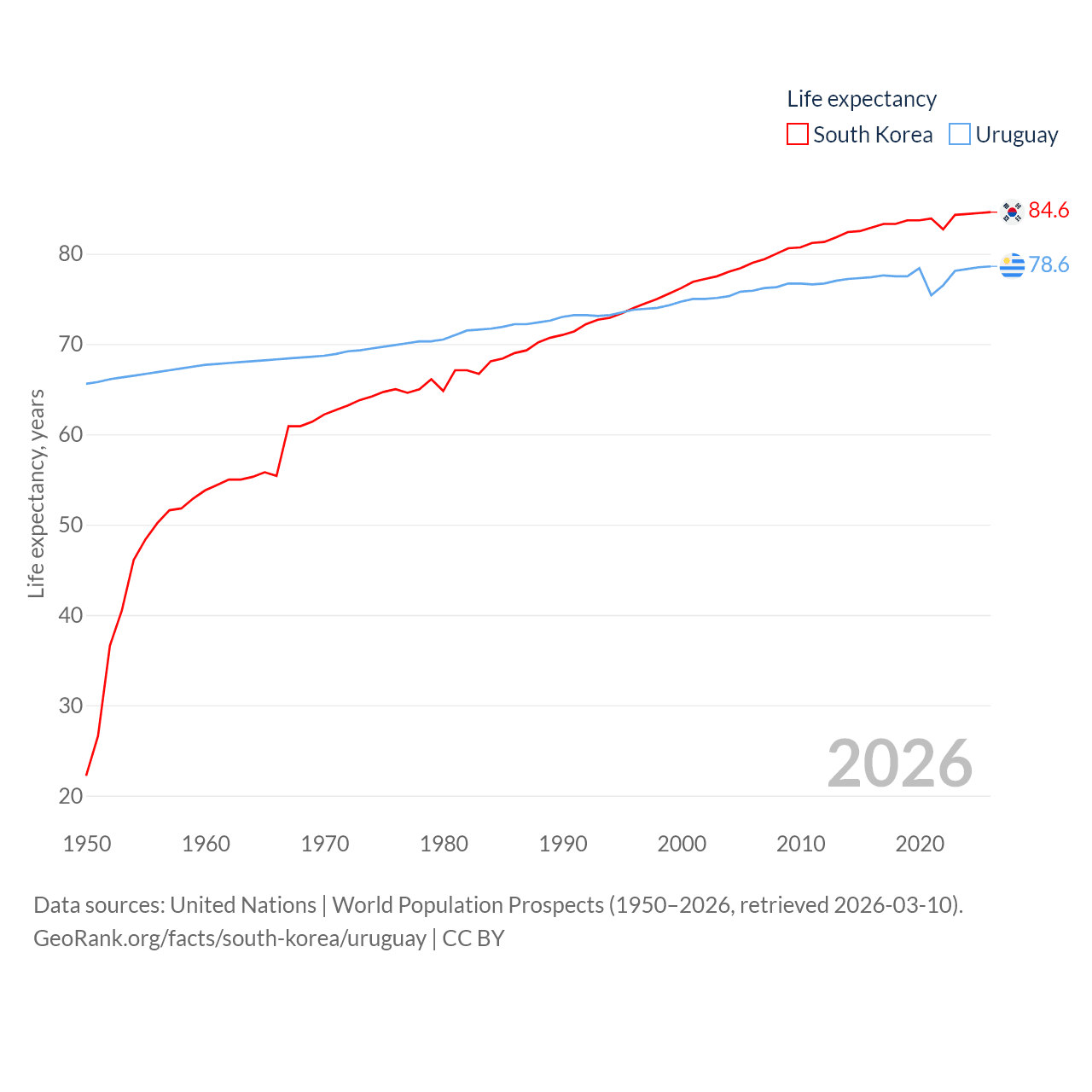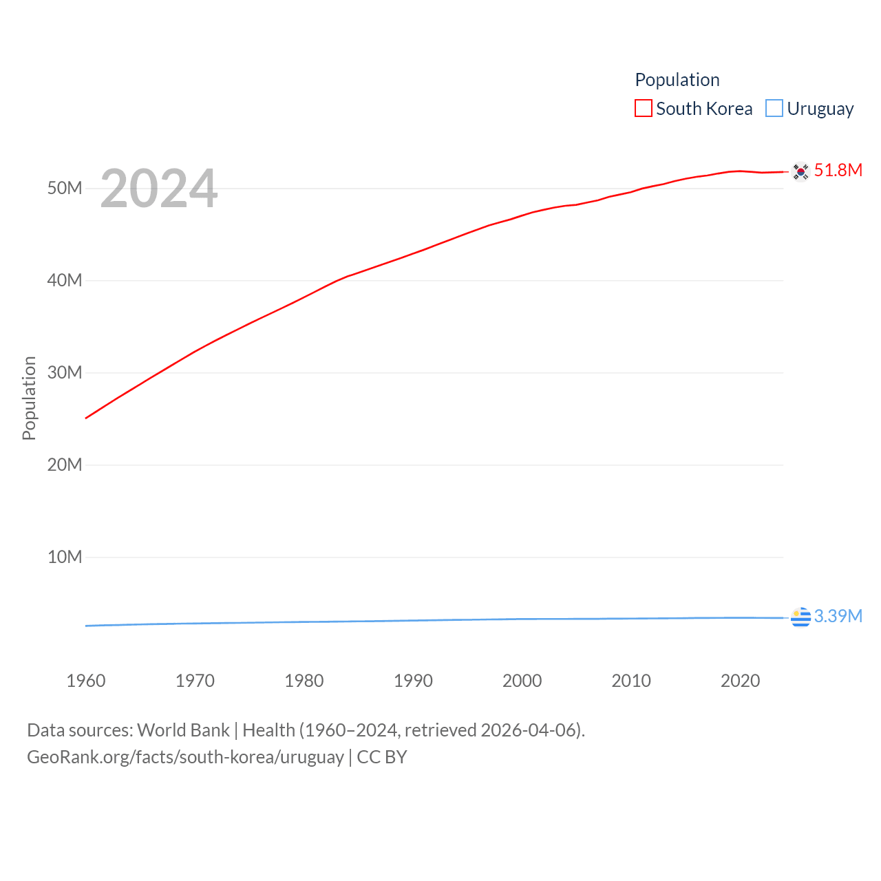 South Korea has a population of 51.8M (ranked 29/197), compared with 3.39M in Uruguay (ranked 133/197). South Korea's land area is 37,684 sq mi versus 67,576 sq mi for Uruguay (ranked 105th vs. 89th).