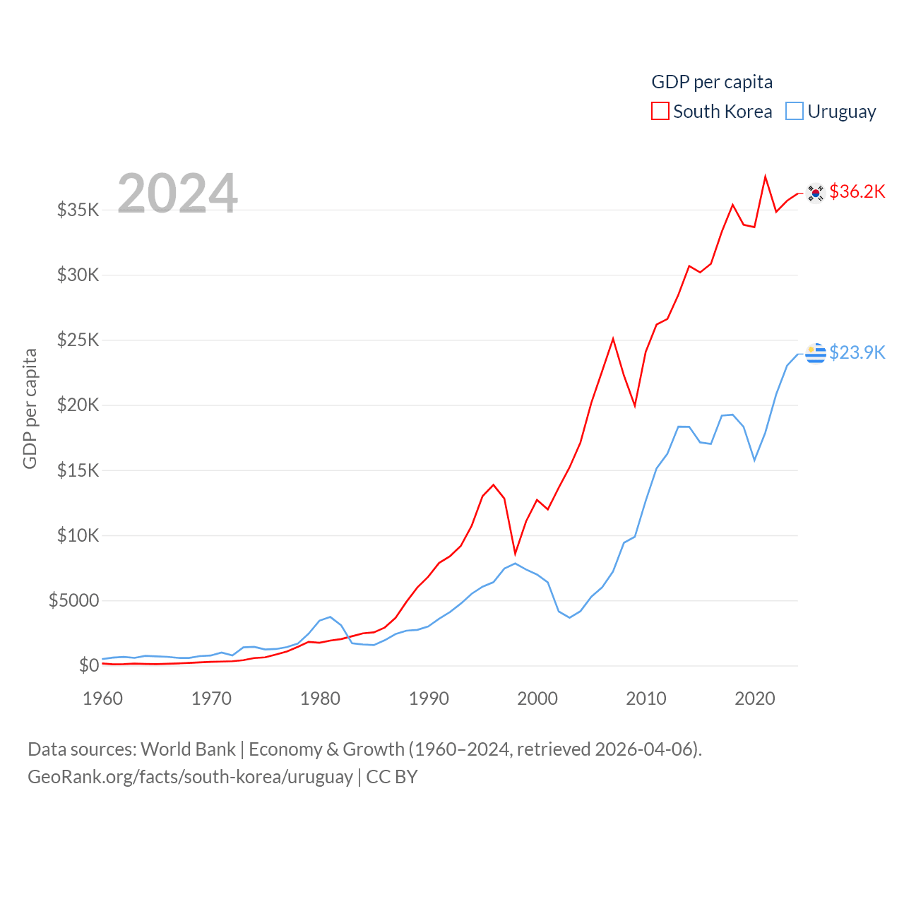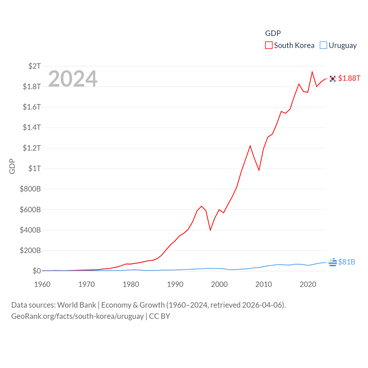 By GDP, South Korea ranks 12/197 ($1.88T) and Uruguay ranks 81/197 ($81B). By GDP per capita, South Korea ranks 31/197 ($36,239), while Uruguay ranks 52/197 ($23,907).