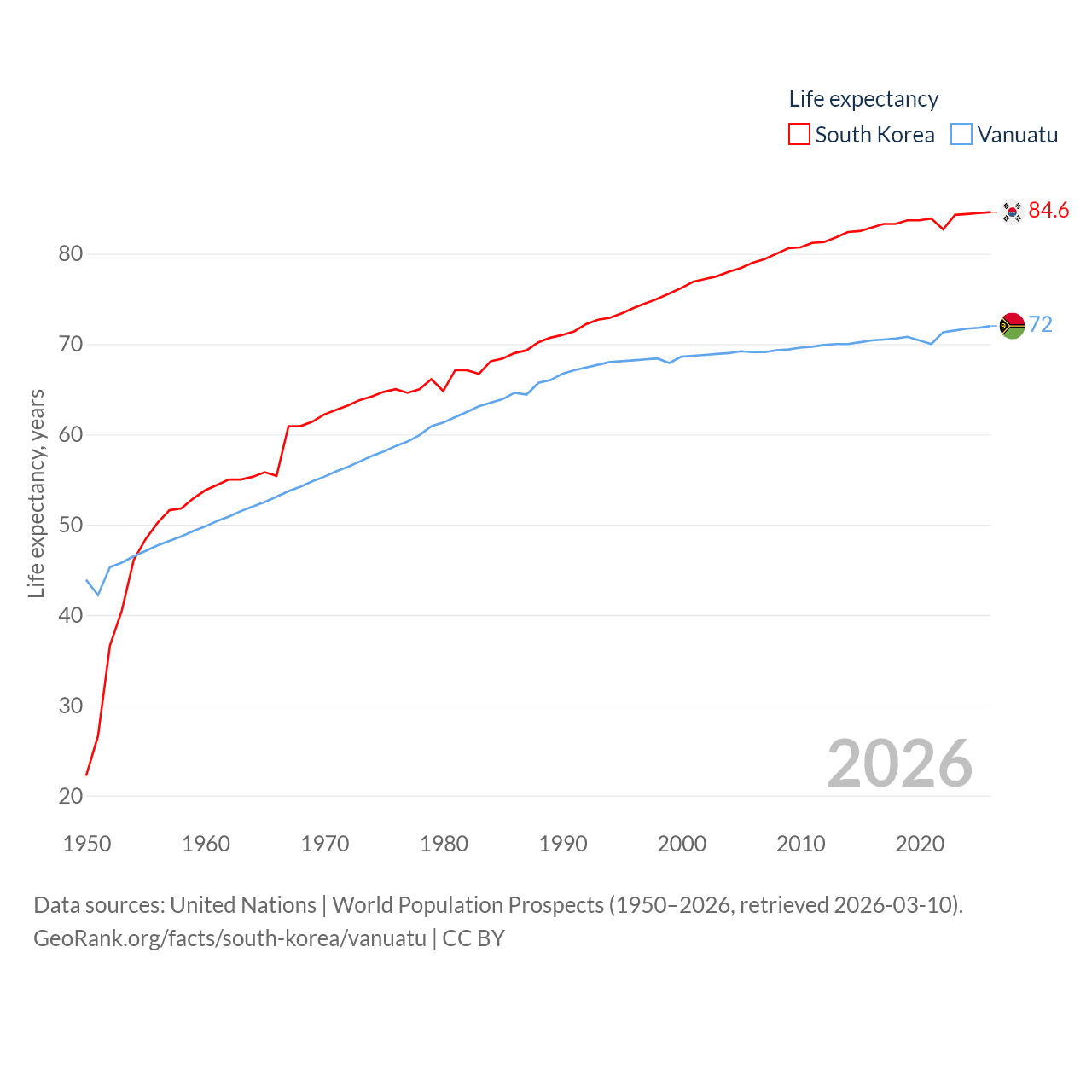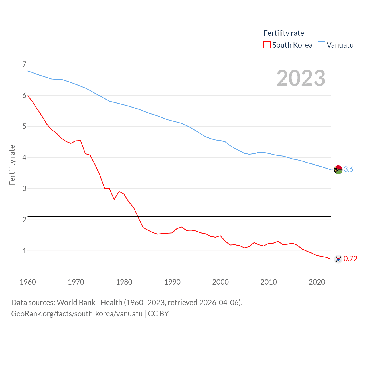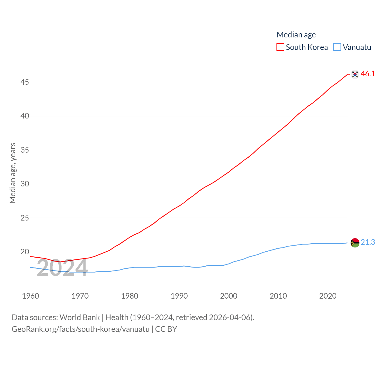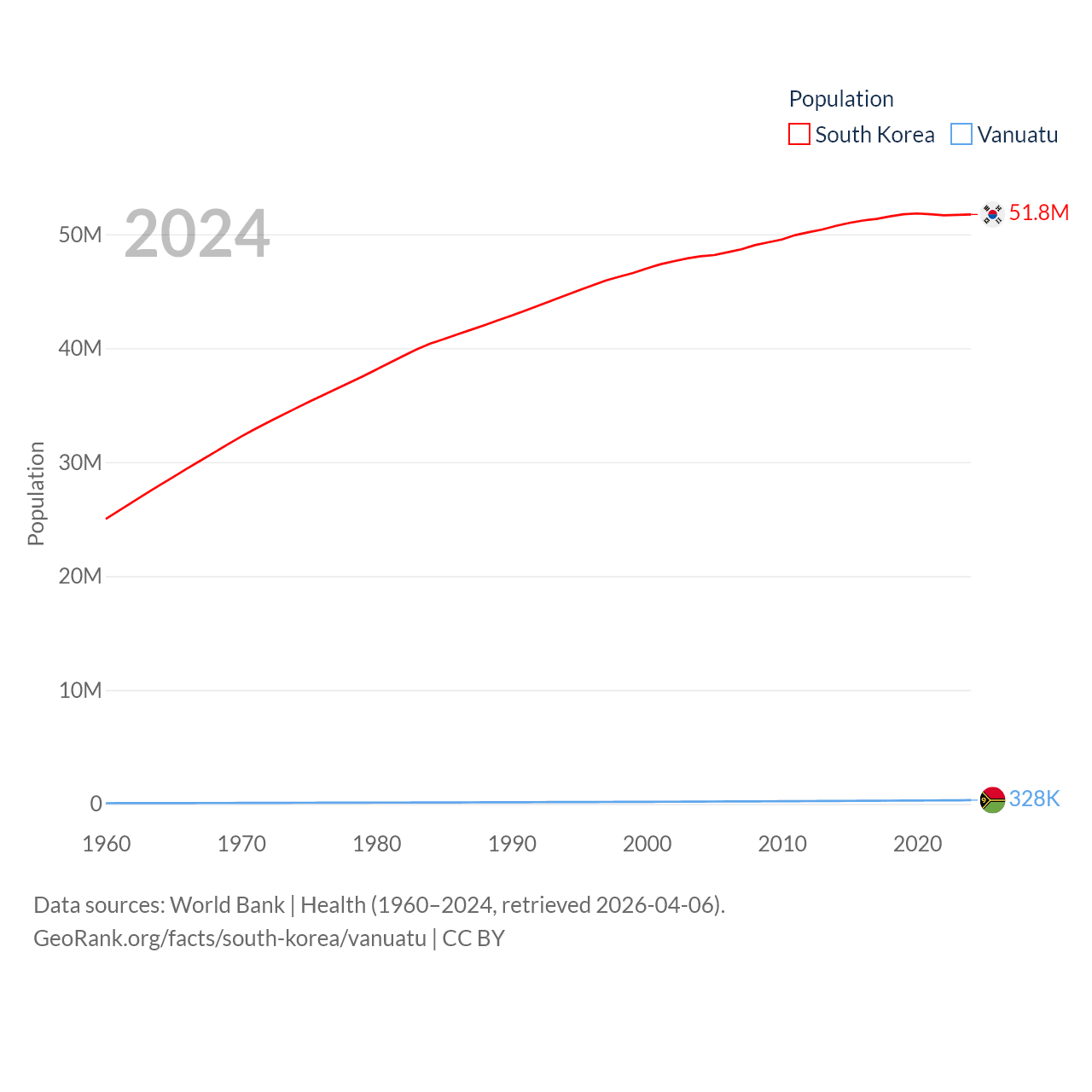 South Korea has a population of 51.8M (ranked 29/197), compared with 328K in Vanuatu (ranked 174/197). South Korea's land area is 37,684 sq mi versus 4,707 sq mi for Vanuatu (ranked 105th vs. 157th).