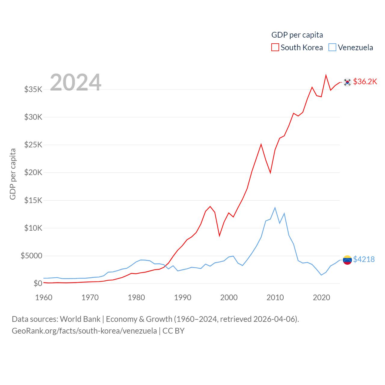 By GDP, South Korea ranks 12/197 ($1.88T) and Venezuela ranks 65/197 ($120B). By GDP per capita, South Korea ranks 31/197 ($36,239), while Venezuela ranks 128/197 ($4,218).