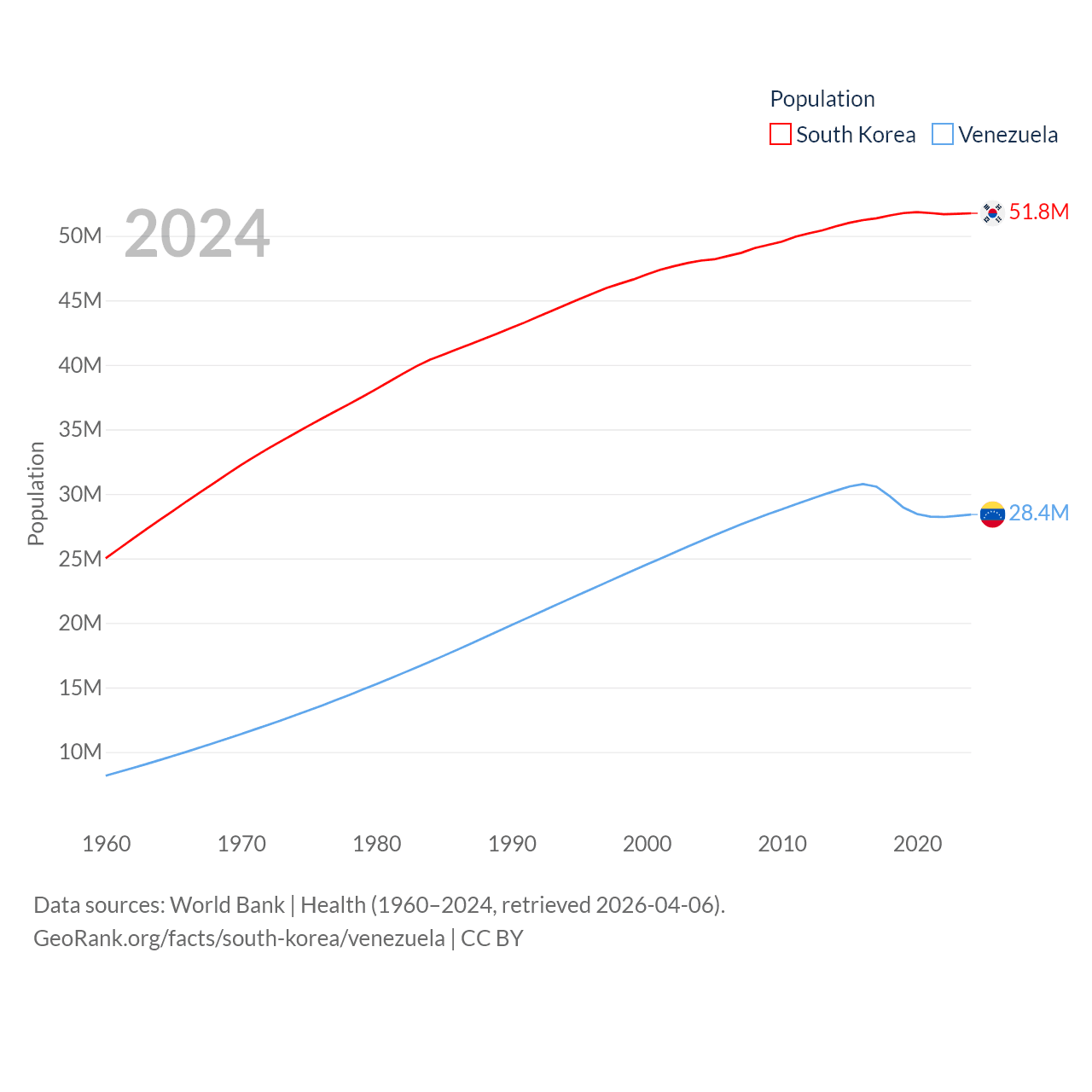 South Korea has a population of 51.8M (ranked 29/197), compared with 28.4M in Venezuela (ranked 53/197). South Korea's land area is 37,684 sq mi versus 340,561 sq mi for Venezuela (ranked 105th vs. 32nd).