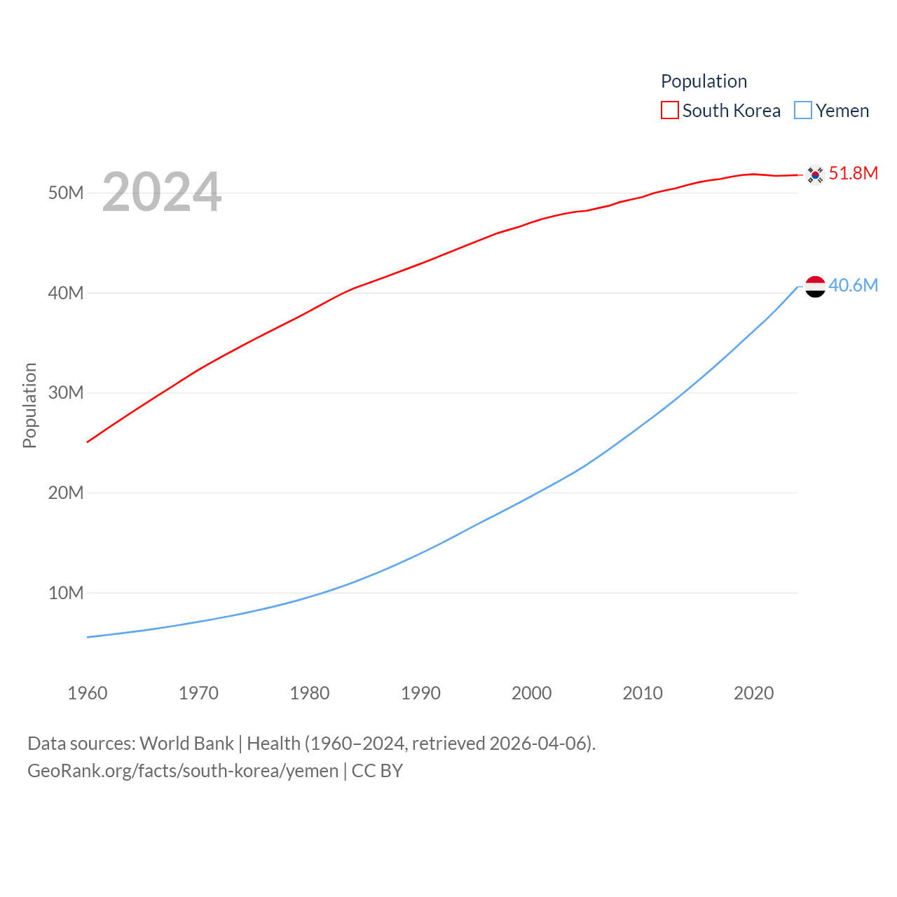South Korea has a population of 51.8M (ranked 29/197), compared with 40.6M in Yemen (ranked 38/197). South Korea's land area is 37,684 sq mi versus 203,850 sq mi for Yemen (ranked 105th vs. 49th).