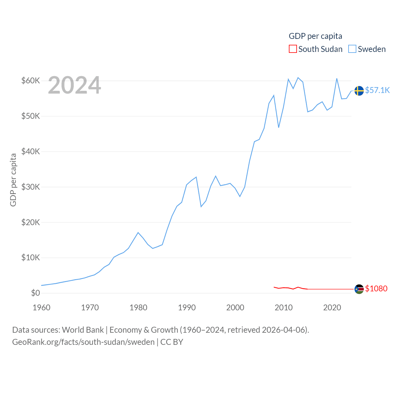 By GDP, South Sudan ranks 149/197 ($12B) and Sweden ranks 26/197 ($604B). By GDP per capita, South Sudan ranks 175/197 ($1,080), while Sweden ranks 17/197 ($57,117).