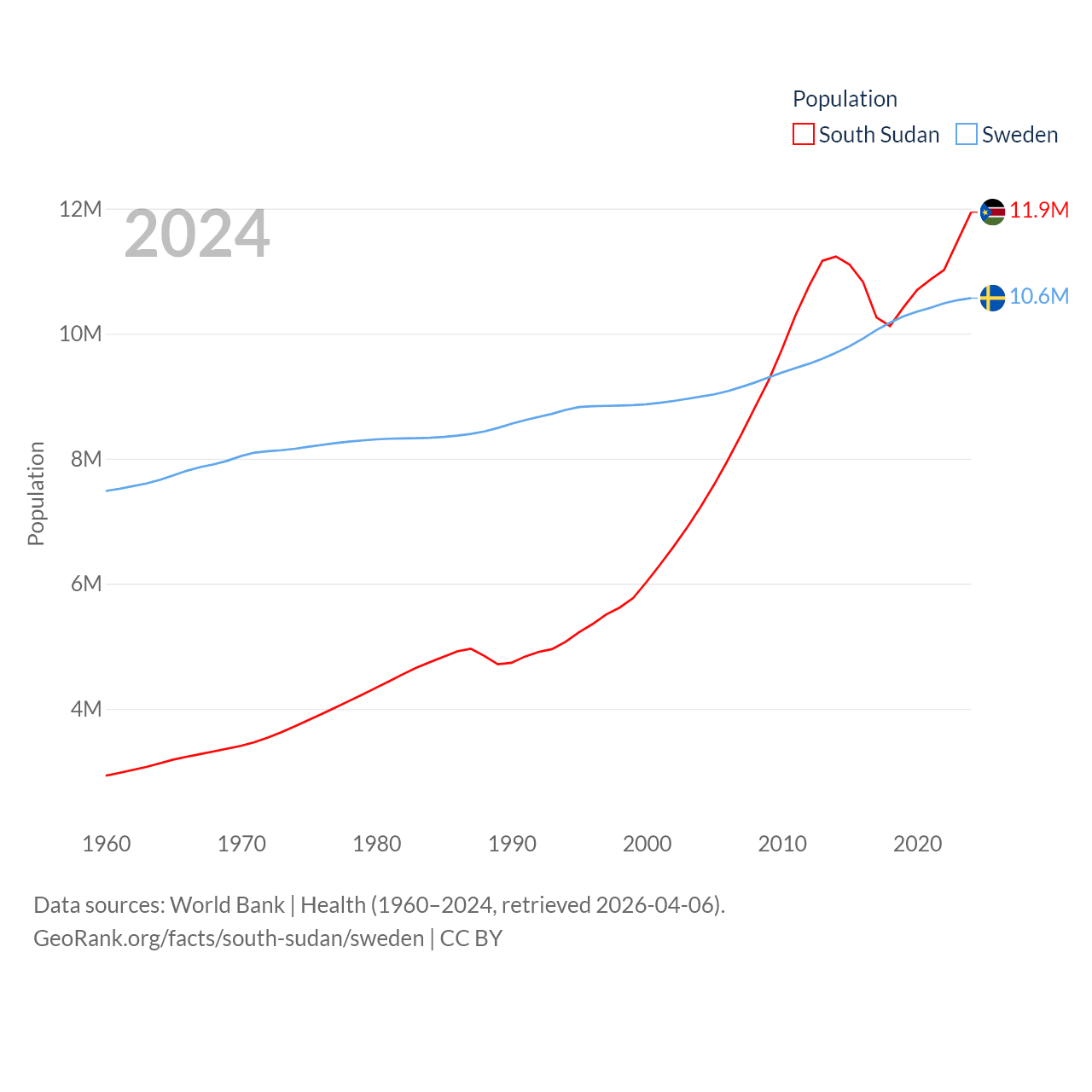 South Sudan has a population of 11.9M (ranked 81/197), compared with 10.6M in Sweden (ranked 93/197). South Sudan's land area is 243,990 sq mi versus 157,248 sq mi for Sweden (ranked 41st vs. 58th).